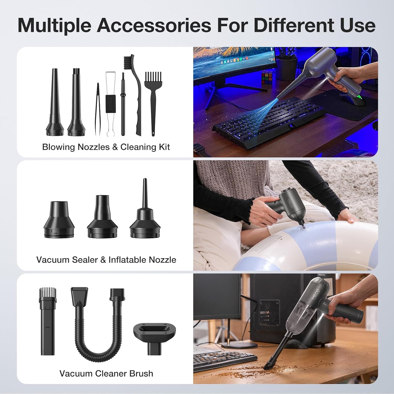 - 4in1 Design: In addition to effective vacuuming and cleaning, you can also use the compressed air duster to inflate swimming rings or air mattresses, or deflate storage bags to save space. Perfect solution to vacuuming, blowing, inflating, and pumping