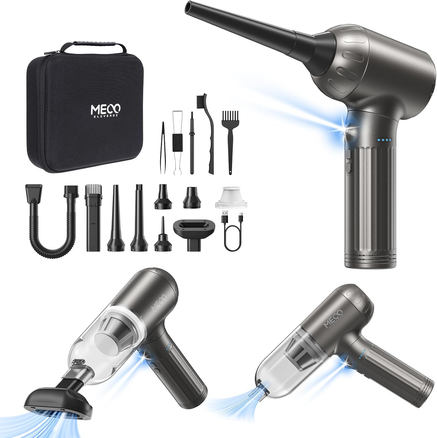 MECO ELEVERDE Compressed Air Duster Electric, 130000RPM 4in1 Air Duster Vacuum/Mini Vacuum/Air Blower & Pump, 3 Gear Brushless Motor with LED Light for PC, Keyboard, Car, Carpet (Gray)