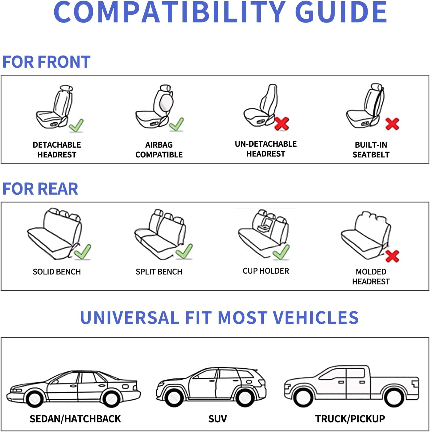 - ❤ 【Universal Fit】: Car seat covers full set. Each pack comes with 2 front seat covers , which are compatible with most Cars, SUV, Truck and Pick-up. You can easily install a custom new look on your seats without any hassles.