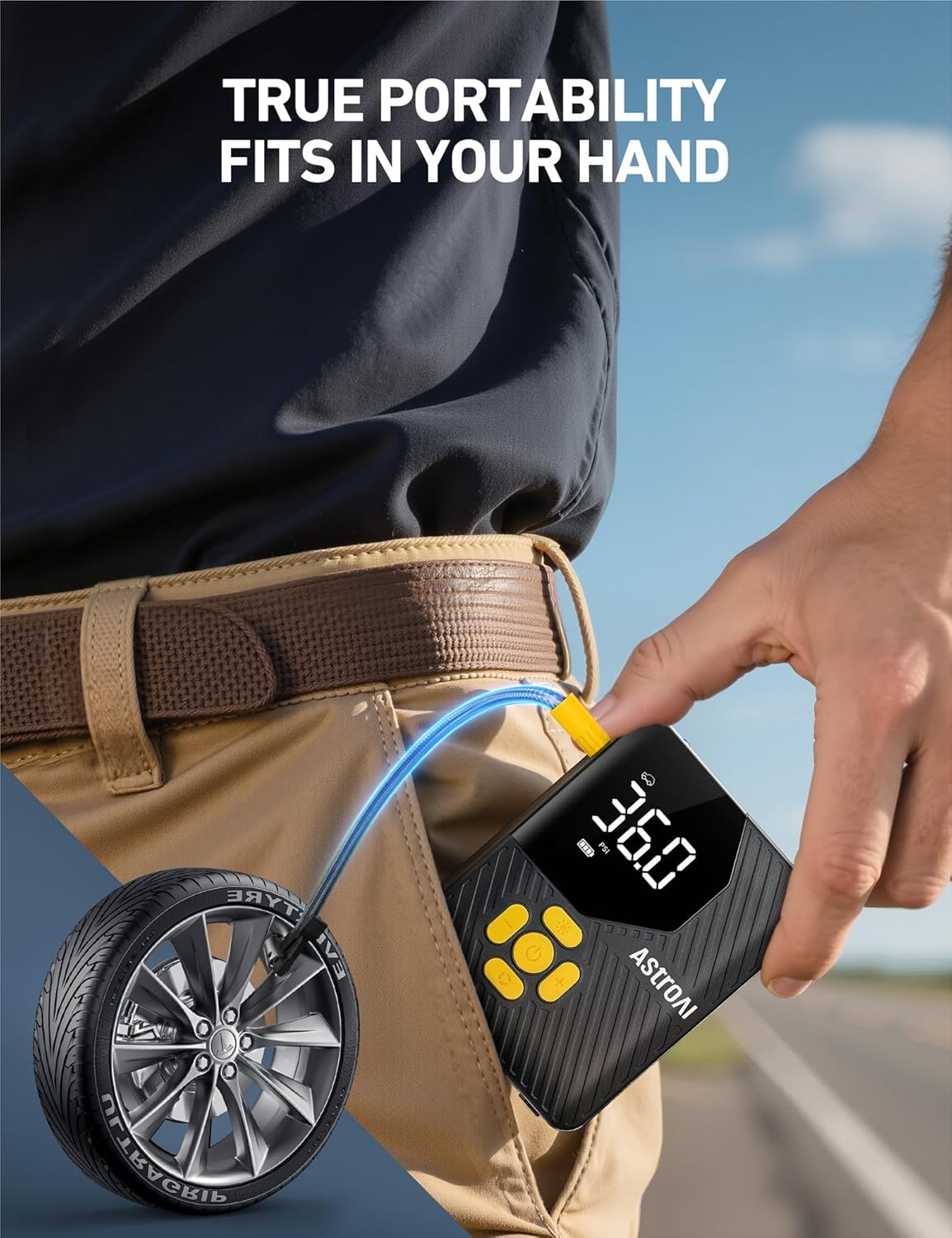 - COMPACT SIZE & MASSIVE POWER: This palm-sized tire inflator weighs less than an apple but is massively powerful. It can inflate a car tire (30PSI-36PSI)/bicycle tire/swim ring in 60 seconds. Grab this versatile tool and go! It’s perfect for camping, traveling, and other outdoor activities.