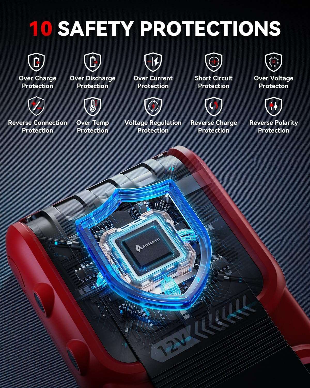 - 【10 SAFETY PROTECTIONS】With UL Certification, this guarantees the device meets stringent safety standards.The intelligent safety terminals of this car starter feature 10 advanced Overload Protection,Sparks Protection,Reverse Charges Protection,Reverse Polarities Protection,Over Currents Protection,Low Temperature Protection,Over Charges Protection,Short Circuits Protection,Over Voltages Protection,High Temperatures Protection
