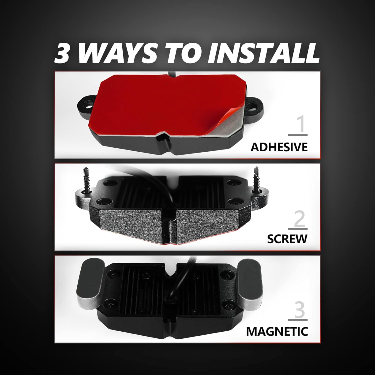- [WIDE ANGLE & SUPER BRIGHT] Introducing our all-new LED rock lights! Equipped with dual-angle, high-quality LEDs that deliver over 400 lumens of bright, powerful light. With an expansive 213-degree coverage angle, these lights ensure maximum visibility and a stunning, wide-reaching glow for your vehicle.