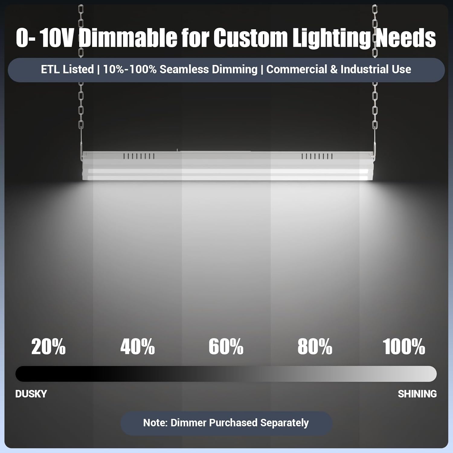 - 0-10V DIMMABLE AND ANTI-GLARE - This high bay LED light is 0-10V dimmable, allows you to control LED output intensity to achieve optimum lighting effect (Dimmer switch not included). Using frosted polycarbonate lens, it’s also anti-glare and non-dazzling.