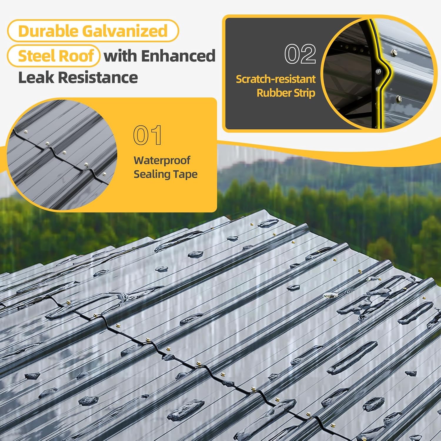 - Weather Resistance: The carport roof is designed with a sturdy triangular structure, extra crossbars, and two steel wire cables, capable of withstanding wind speeds up to 100 MPH and snow loads of 35 PSF. High-density waterproof tape between the panels ensures stable protection for your vehicles and property in harsh weather conditions