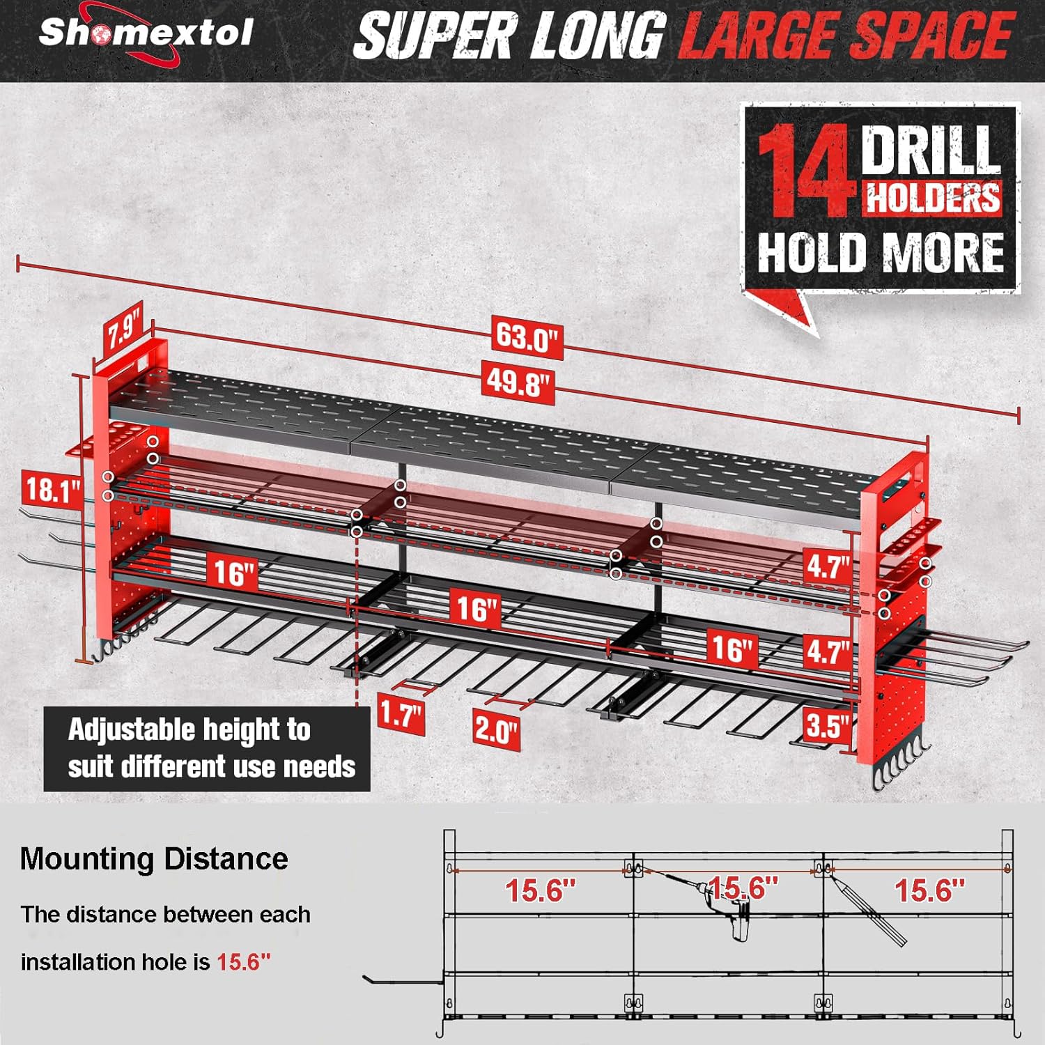 - 4-Layer Capacity &14 Drill Holders: The tool storage organizer offer 3 fixed layers and 1 adjustable layer, versatile storage options, and efficient organization of various tools and equipment; 4-Layer capacity design with 14 cordless drill holder; The garage organization is equipped with perforated panels on both sides, adding plenty of hanging space to easily organize your toolbox, drills, chargers, batteries, hammers and screwdrivers.