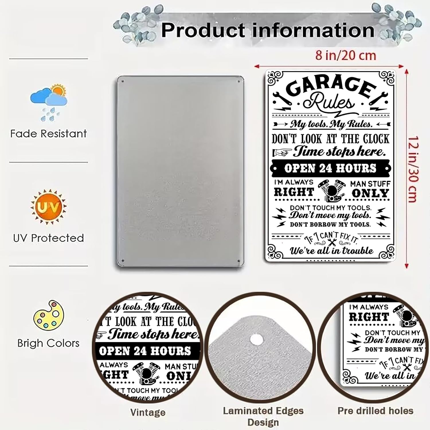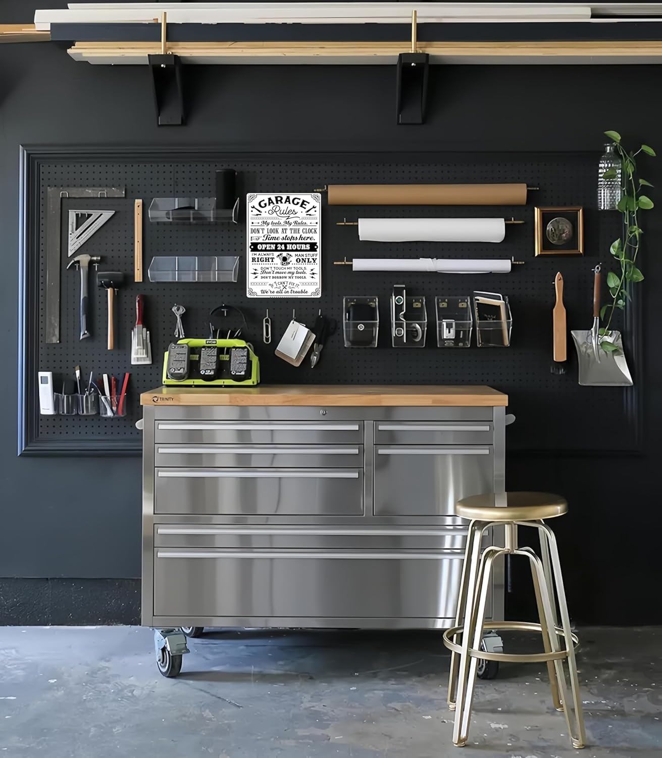 - Humorous & Authoritative Design: Features playful garage rules like "My tools. My Rules" and "Don’t touch my tools," adding personality to any workspace.