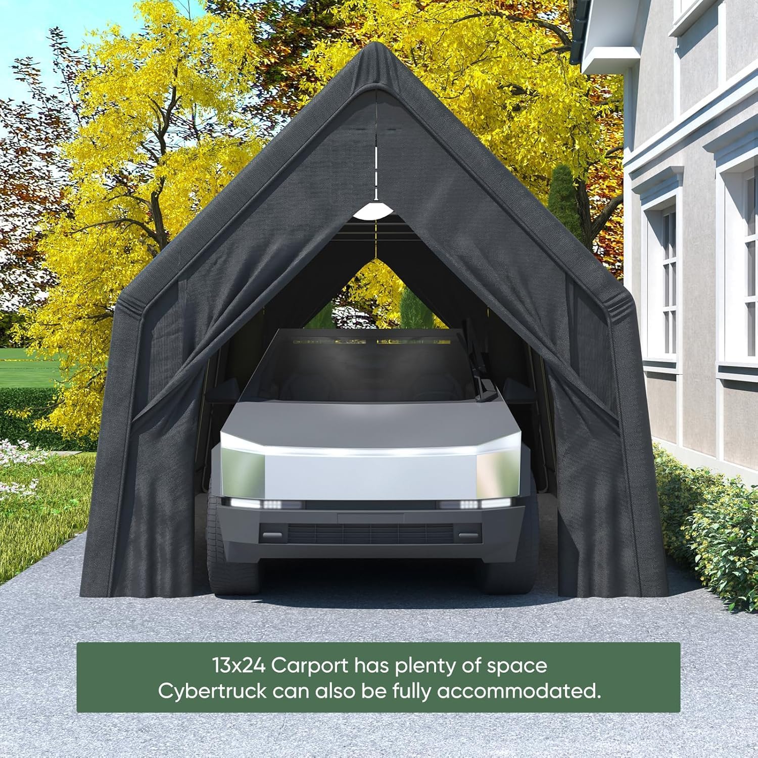 - 【Extra Large Carport】: The carport canopy is big enough.The carport's length, width and height dimensions are 24FT, 13FT and 12FT respectively, which can accommodate not only the Tesla CYBERTRUCK, but also various other cars and yachts;