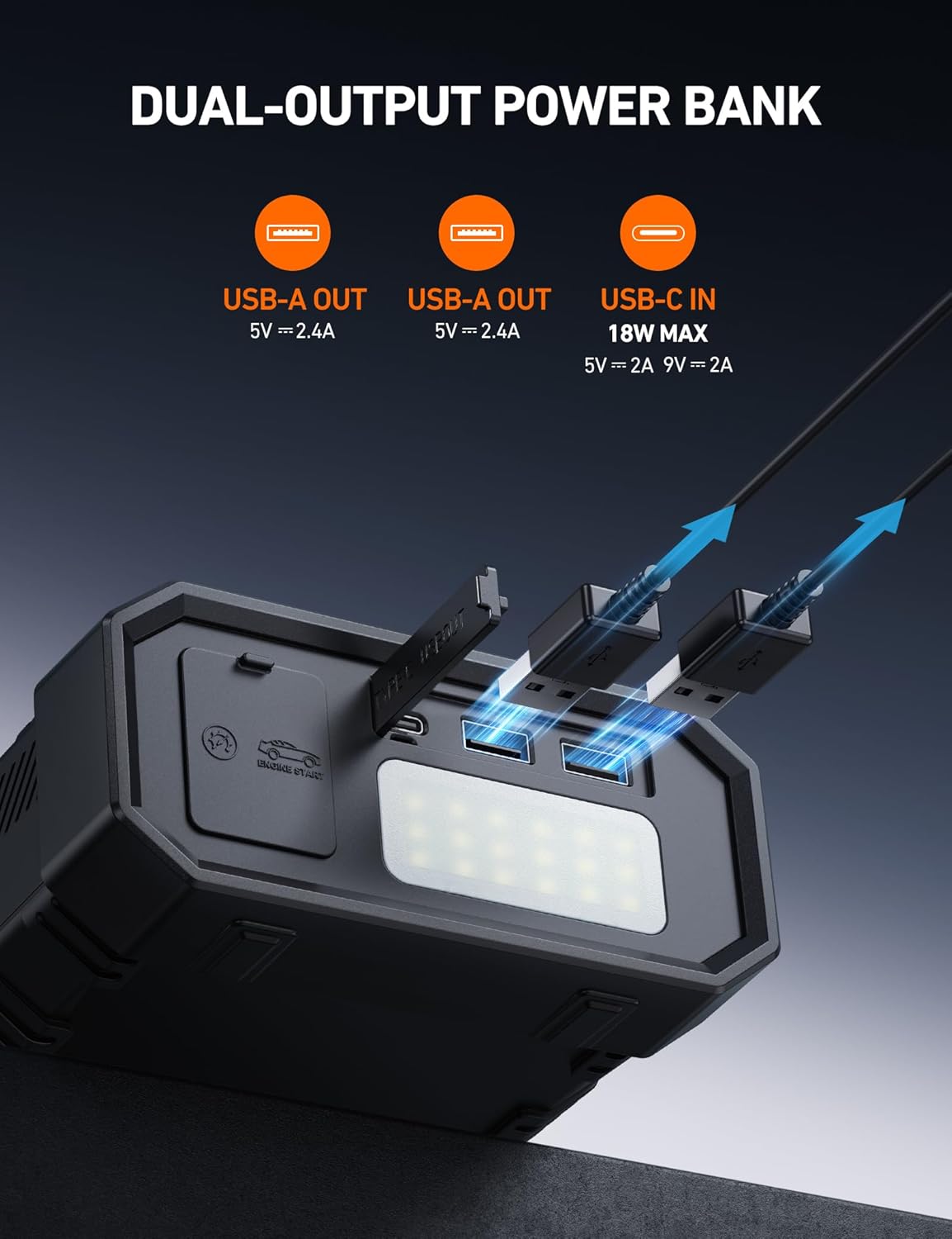 - 【POWER BANK & FLASHLIGHT】The A30 serves as a portable power bank, featuring 2 USB-C output ports to charge multiple devices simultaneously. With an 18W maximum input, the unit itself can be fully recharged in just 2-3 hours. The 400-lumen LED flashlight is 3 to 5 times brighter than standard devices and includes SOS, strobe, and normal flashlight modes, making it an indispensable tool for roadside emergencies.