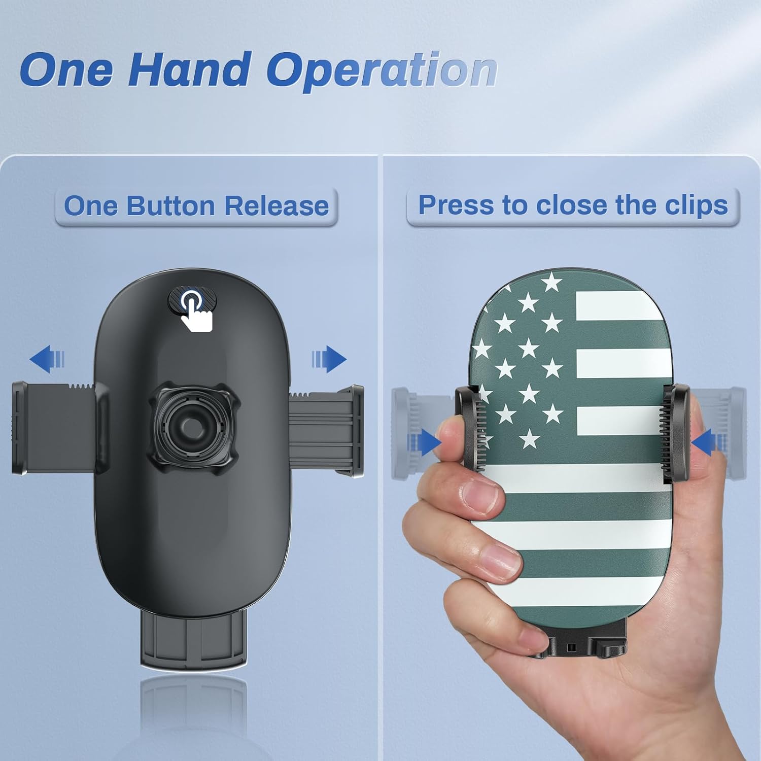 - Quick One-Button Release: Effortlessly mount and remove your phone with the one-button release system. Simply press the release button on the back of the cradle, and the clamp arms will smoothly slide open.​