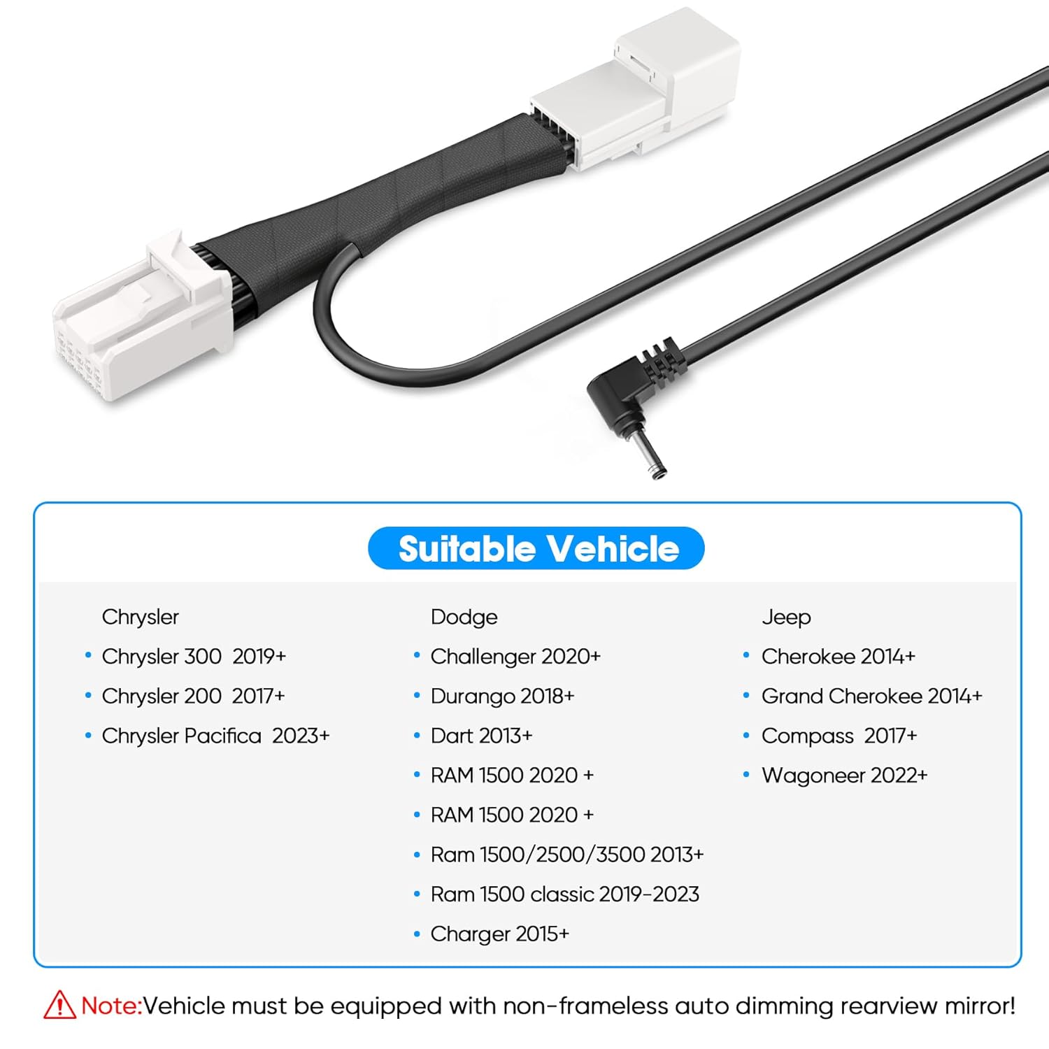 - 【Applicable Models】This radar detector power adapter is suitable for select Dodge RAM 1500 Laramie 2022,Dodge Ram 1500/2500/35002013+,1500 classic 2019-2023,Challenger 2014+,Durango 2014+,Charger 2015+,Chrysler 300 2019+,Chrysler 200 2017+,Chrysler Pacifca 2017+,JEEP Grand Cherokee 2014+,Cherokee 2014-2023,and more with auto-dimming rearview mirror!