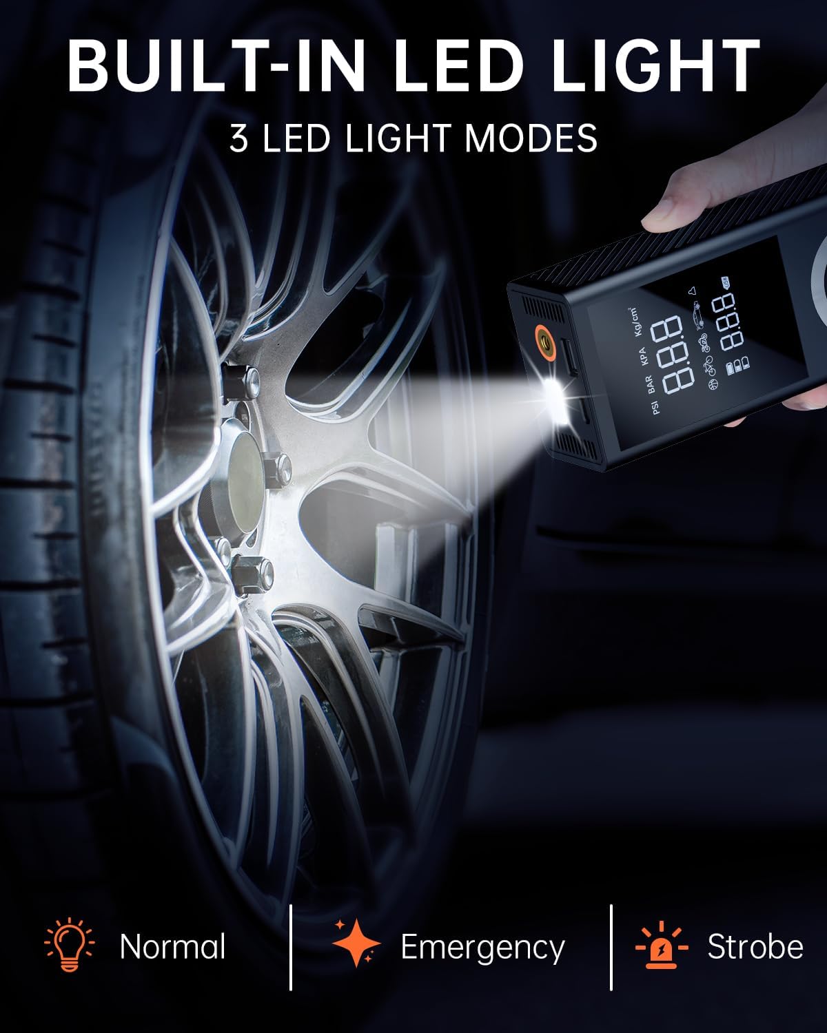 - Multi-Function Tool: This portable air compressor is a multi-functional emergency tool. It features an LED light for inflating in the dark, changing tires, or signaling other vehicles at night. In addition, it comes with a Type-C charging port and a 5V/2A USB output port, which can double as an emergency power bank for electronic devices.