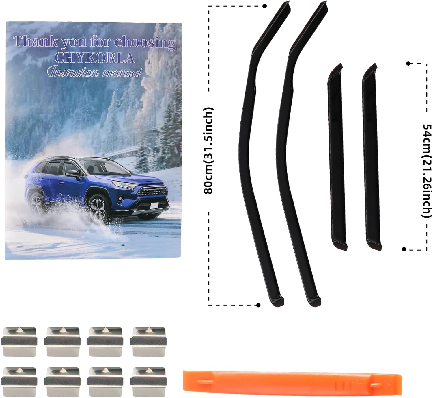 - 【In Channel Design】 Window vent visors install in the window channel, provides perfect fit and sleek look for your car. Come with 4 pcs FULL-SIZE side window deflectors, 8 pcs clips, 1 pcs plastic Crowbar for a durable and secure installation. No complicated instructions are needed. Attention: Please apply the clip to fix the rain guards