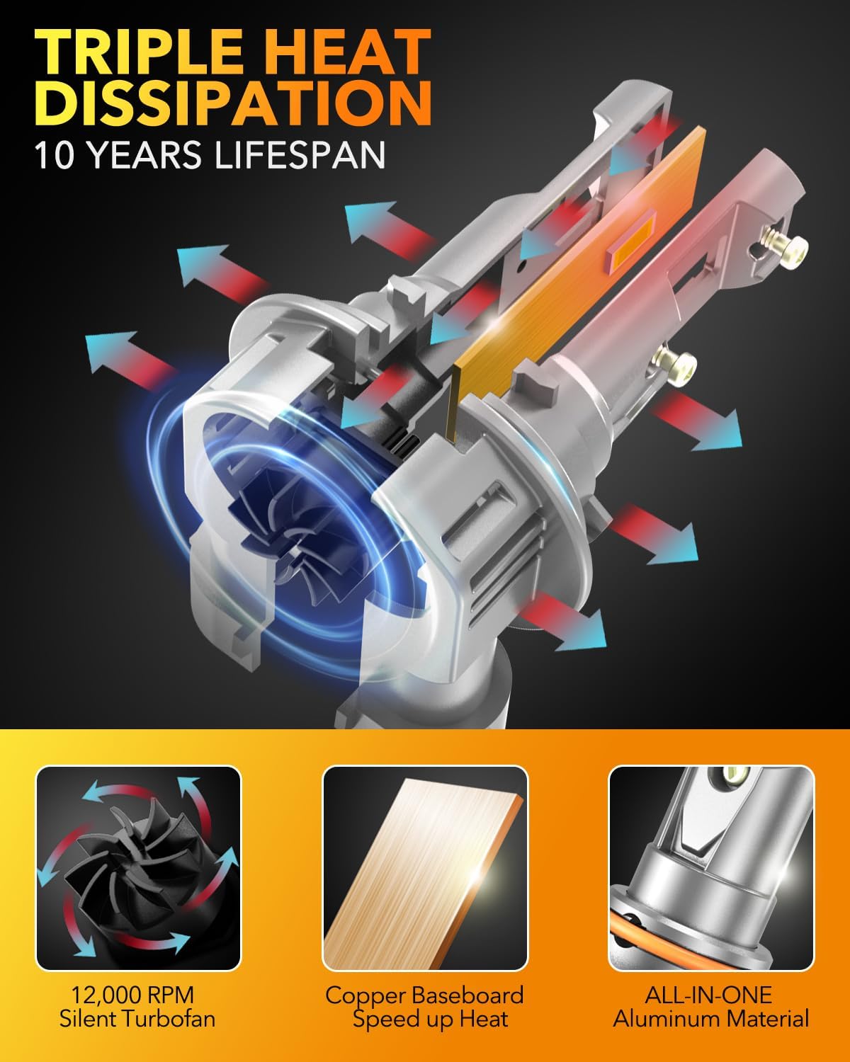 - 【Efficient Cooling System】 Constructed with aviation-grade aluminum and a high-speed cooling fan, these bulbs rapidly dissipate heat, extending lifespan up to 60,000 hours for long-lasting performance.