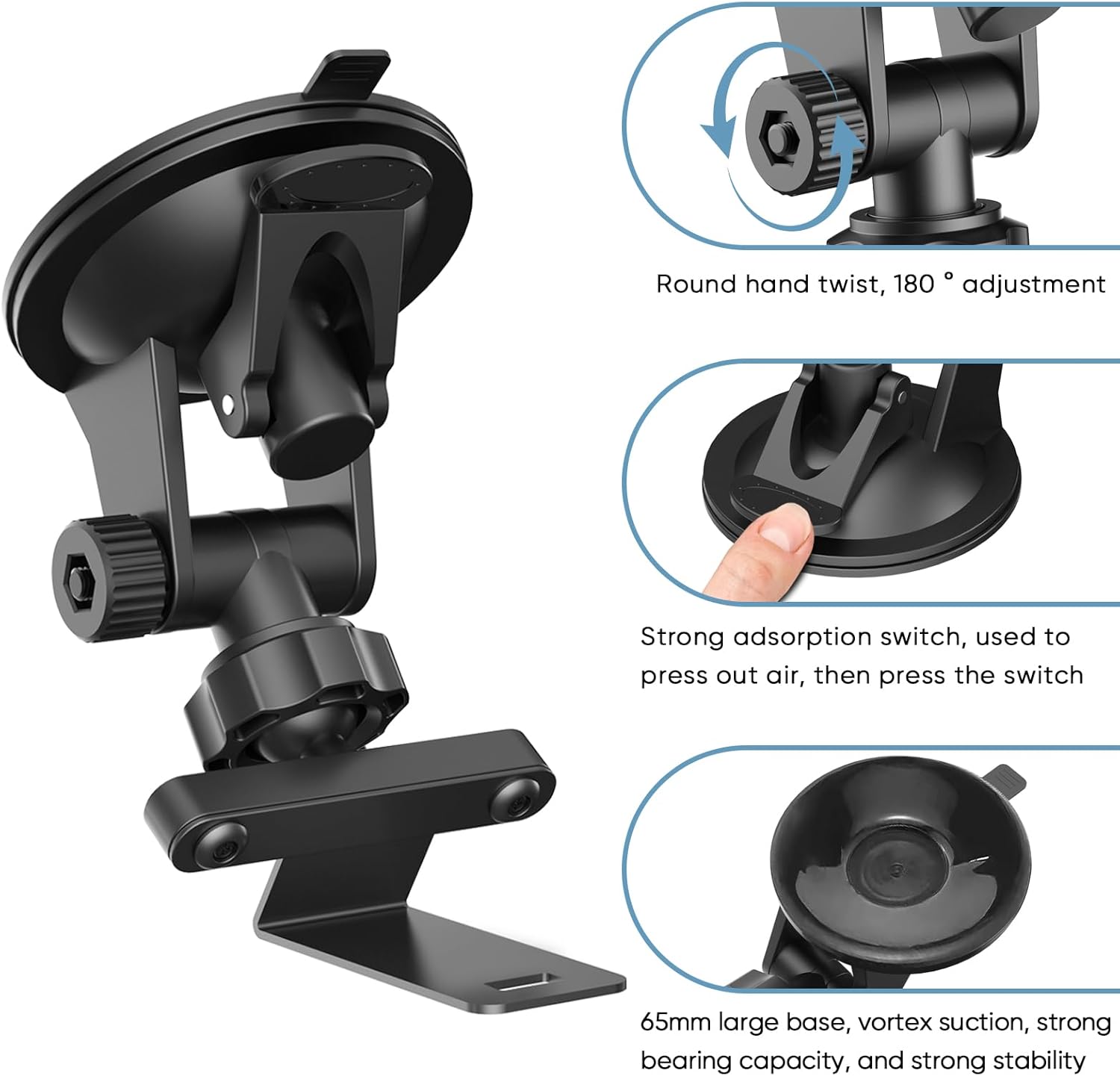 - ONE-PRESS WINDSHIELD SUCTION MOUNT :Upgraded windshield suction cup bracket with vacuum suction cup structure, capable of quick suction with a single press, and can be disassembled without damaging the glass.