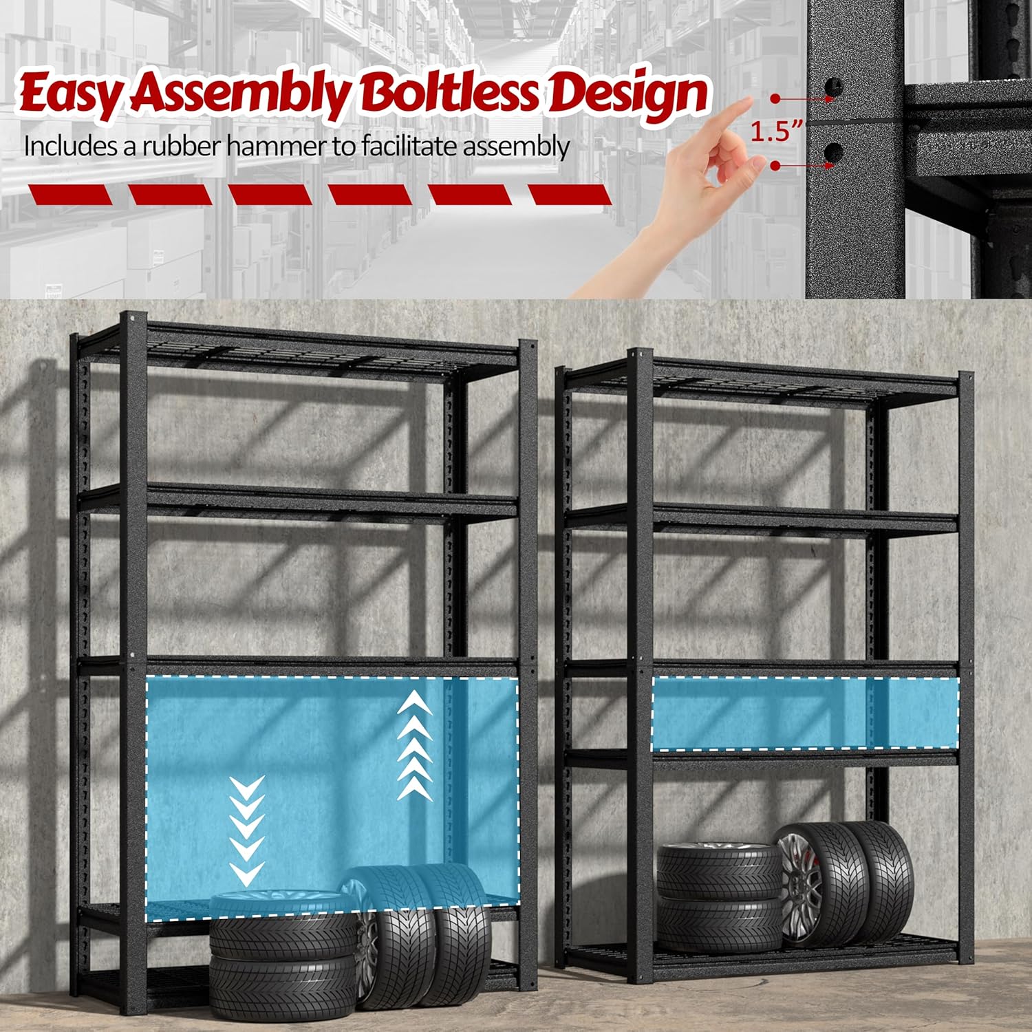 - Adjustable Shelves: These garage storage shelves are made of high-quality thick MDF boards and thicken metal steel frame with black powder coating. It is customizable with 1.58" increments to fit short and tall items.