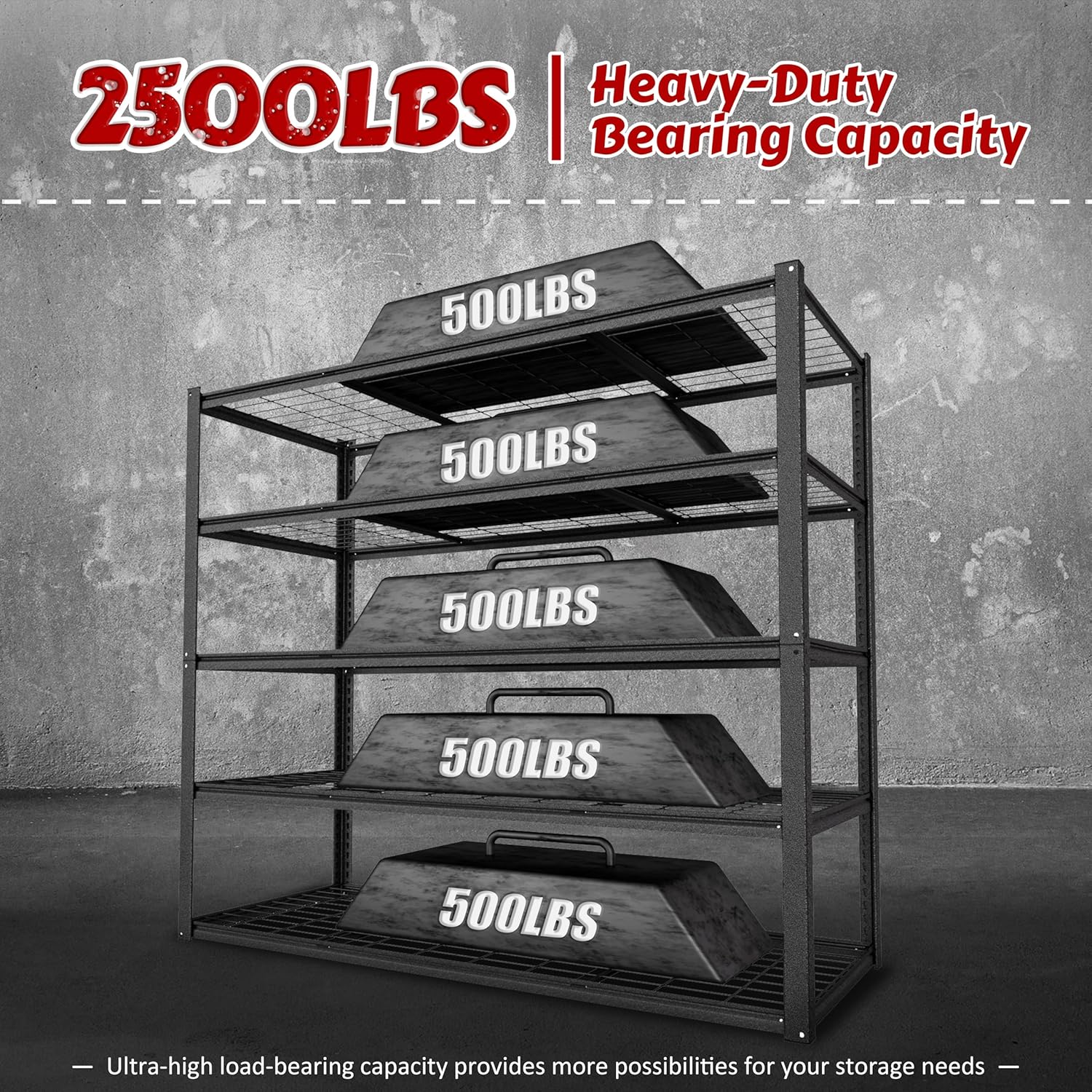 - Sturdy and Heavy Duty: 1 pack Garage shelving assembled dimension: 48" W x 20" D x 72"H, Max Load Per Shelf:600lbs, 5 tier shelves' total max load weight is 2500 lbs. Sturdy metal frame enhanced load-bearing capacity. No wobbling or shaking when fully loaded as this metal shelving has extra support beams which can enhance the stability and durability of the storage shelves.