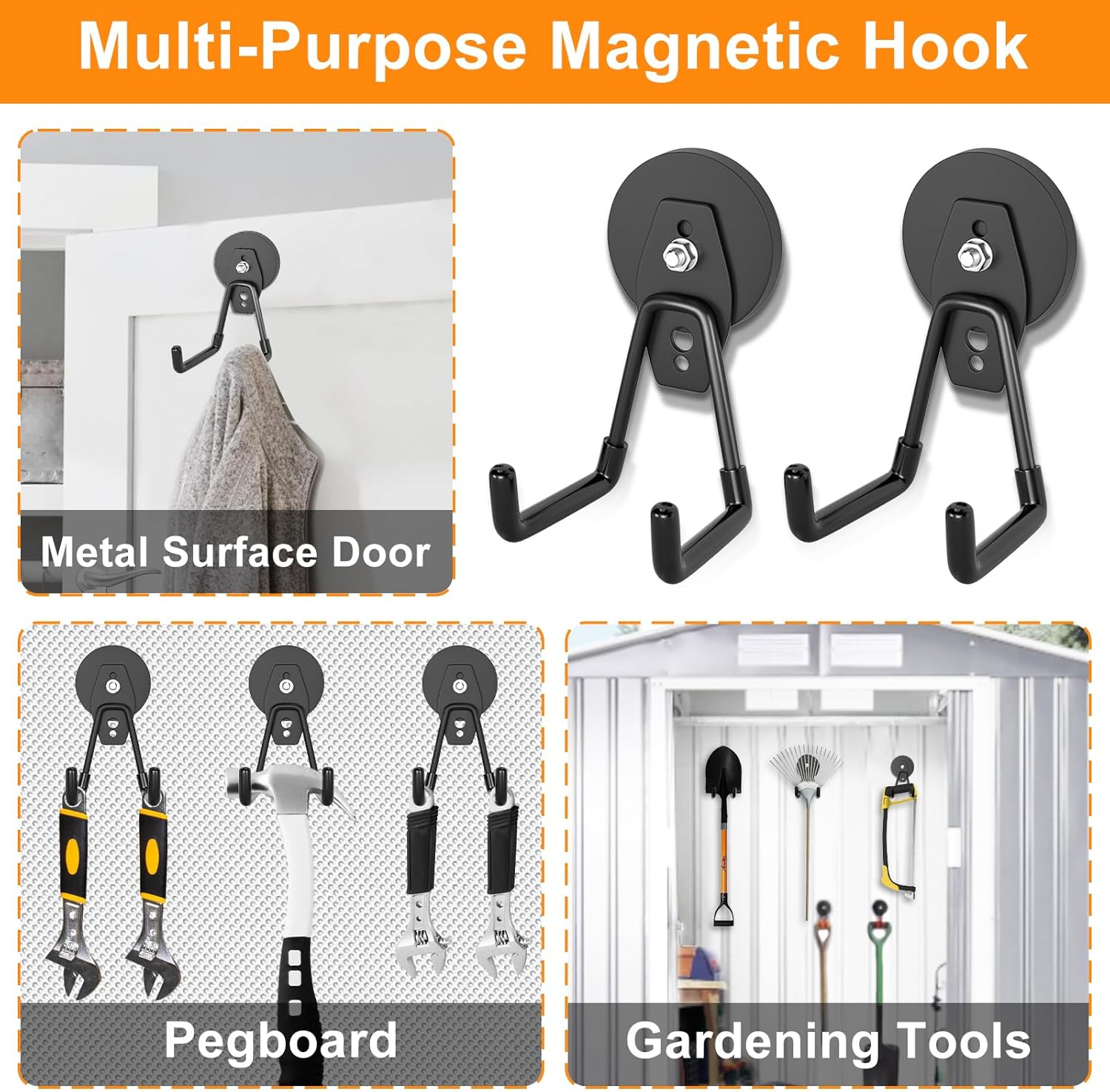 - Premium garage hooks: The industrial magnetic hooks for hanging are made of heavy-duty steel, and the double shape hooks are coated in a PVC layer to protect your tools from marring or scratching.