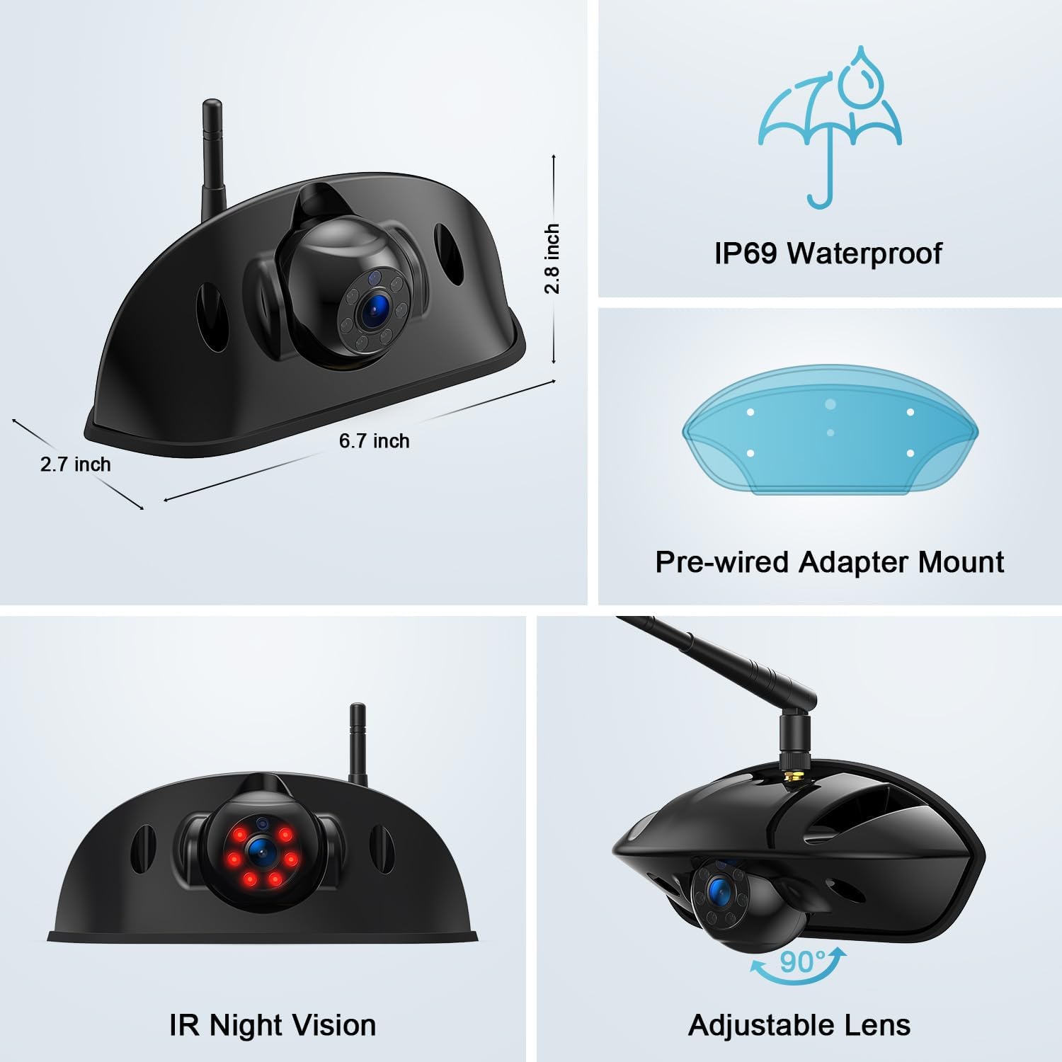 - IP69 Waterproof Rear View Camera with Night Vision: The HD camera with IP69 waterproof and 120-degree viewing angle brings you the best view and longer product life. Equipped with 6 infrared lights and a photoreceptor, the lights automatically turn on when the ambient light is low, it continuously provides you with high-definition images to ensure driving safety. Also, it is compatible with Furrion pre-wired mount, which will save your installation time.