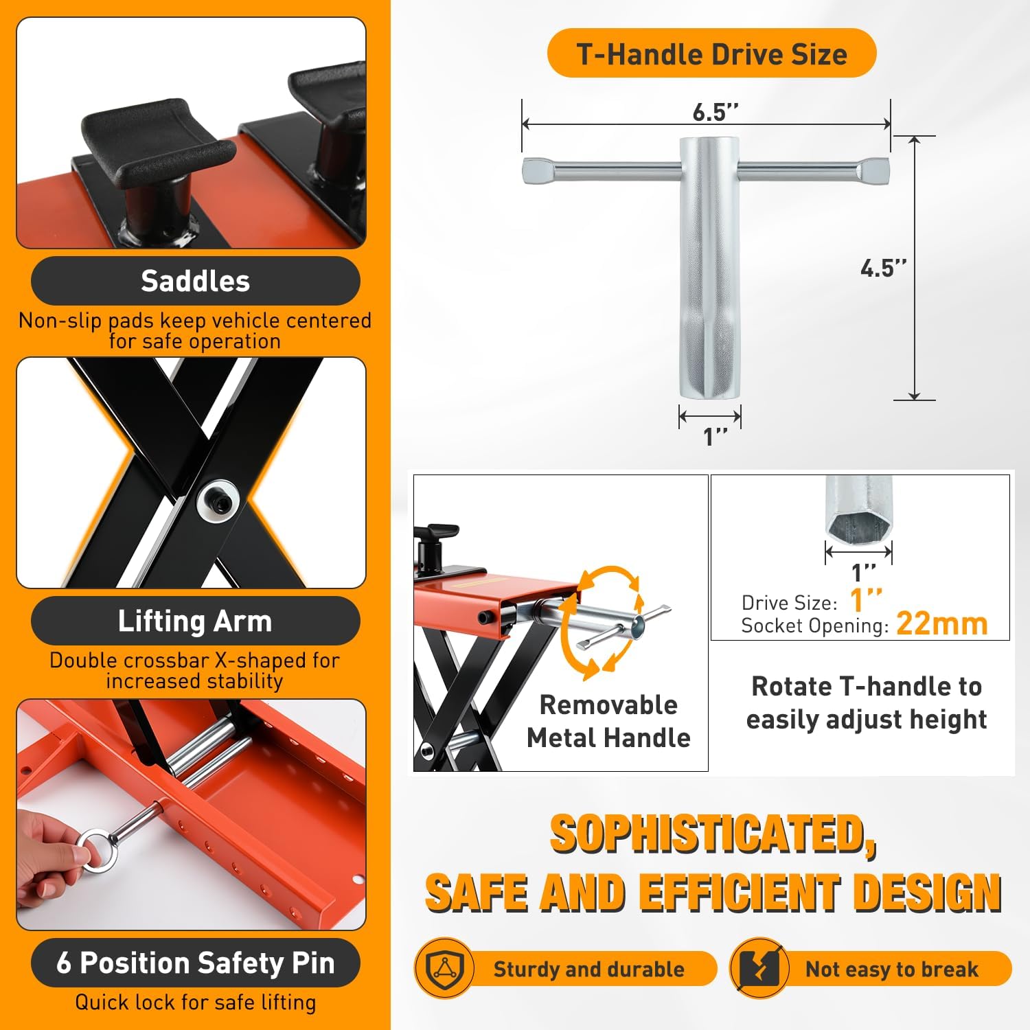 - DUAL PROTECTION FOR SECURITY: In addition to having two non-slip curved saddles, the motorcycle scissor jacks are designed with safety pins that reduce the likelihood of falls during use and provide additional safety. And a 3-inch wing on each side of the base enhances the stability of the jack stand
