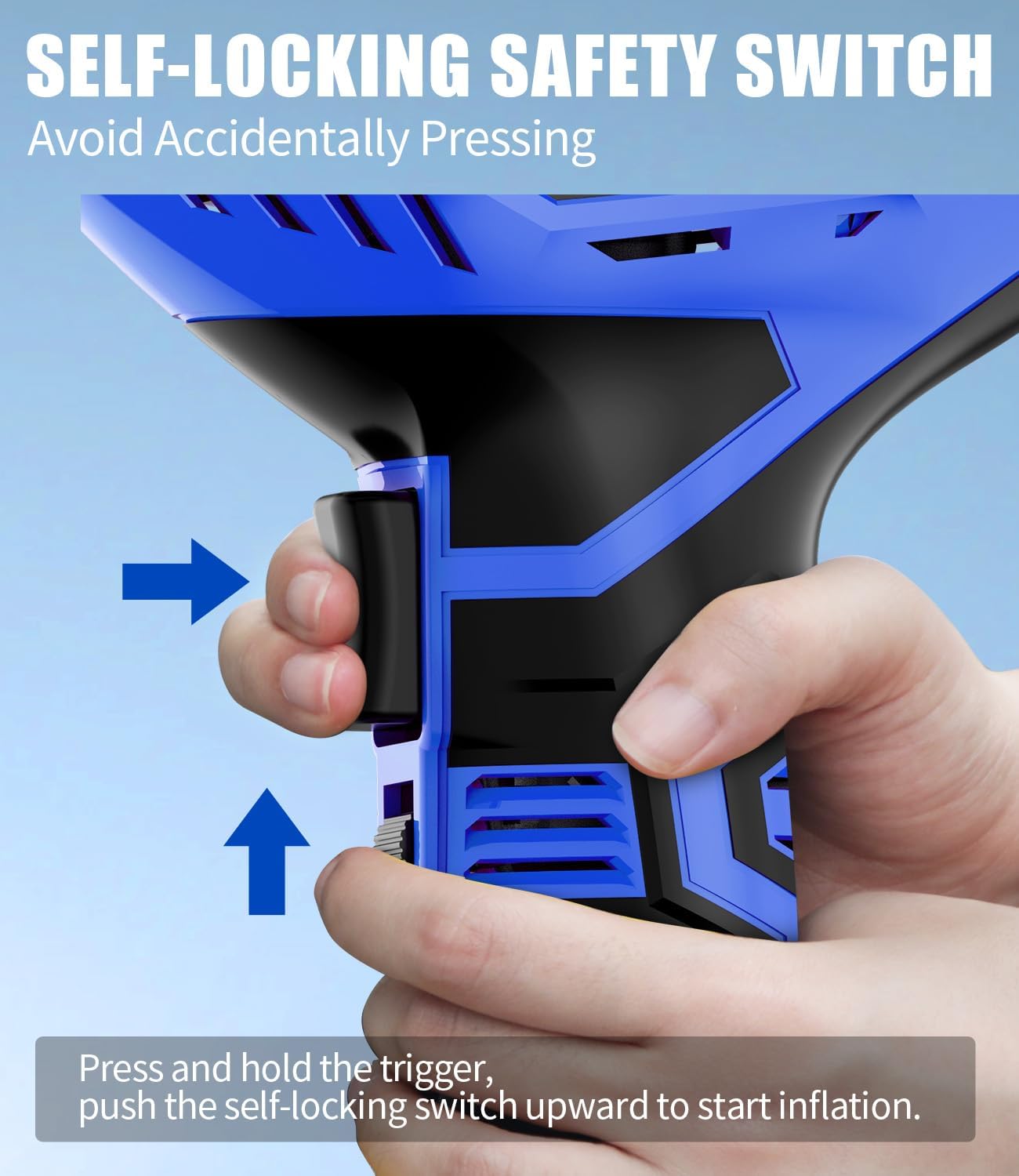 - [Self-locking Safety Switch] This Avid Power tire inflator is equipped with a self-locking switch, which is right below the trigger, preventing you from accidentally pressing the trigger to turn on the air inflator