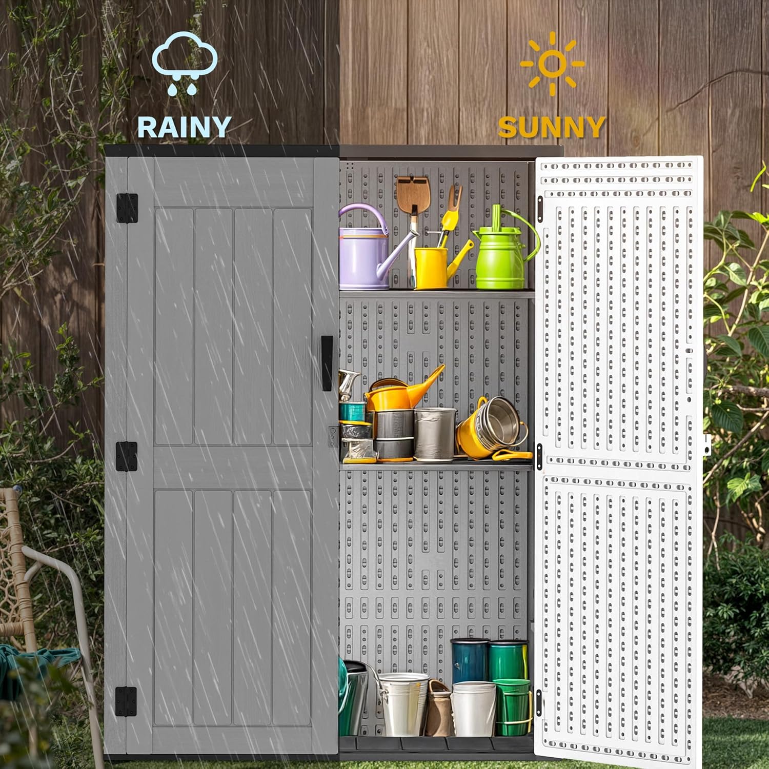 - Maximize Vertical Storage: Make the most of your outdoor space with this tall outdoor storage, allowing you to stash away garden tools, bicycles, pool supplies, and more to keep your outdoor area neat and organized