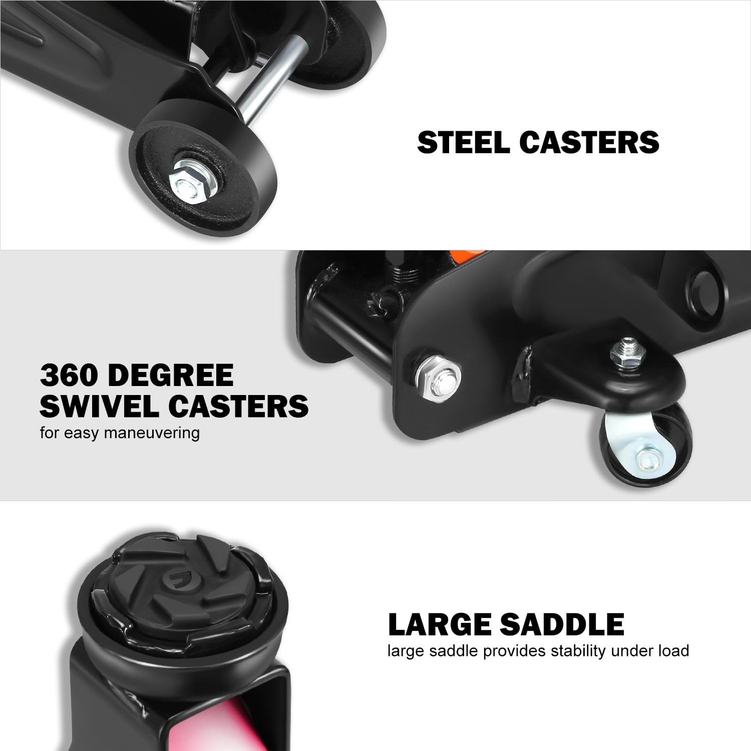 - OVERLOAD PROTECTION & EASY JACK POSITIONING - Built-in dependable safety release valve triggers in the event of an overload to prevent damage or injury. The large saddle provides extra stability and helps protect your vehicle.