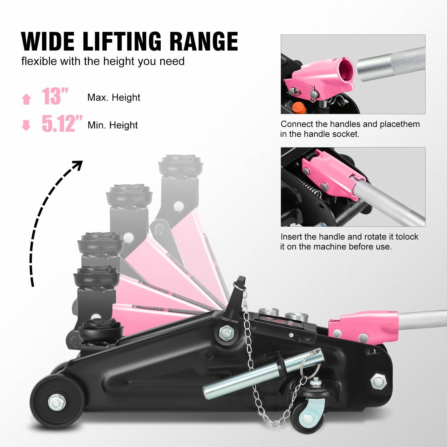 DNA MOTORING Floor Jack with Socket and Lock, Low Profile Hydraulic Trolley Jack for Cars Lift, 2 Ton (4000 lbs) Capacity, Lifting Range 5.12"-13", Pink, TOOLS-00677-PK