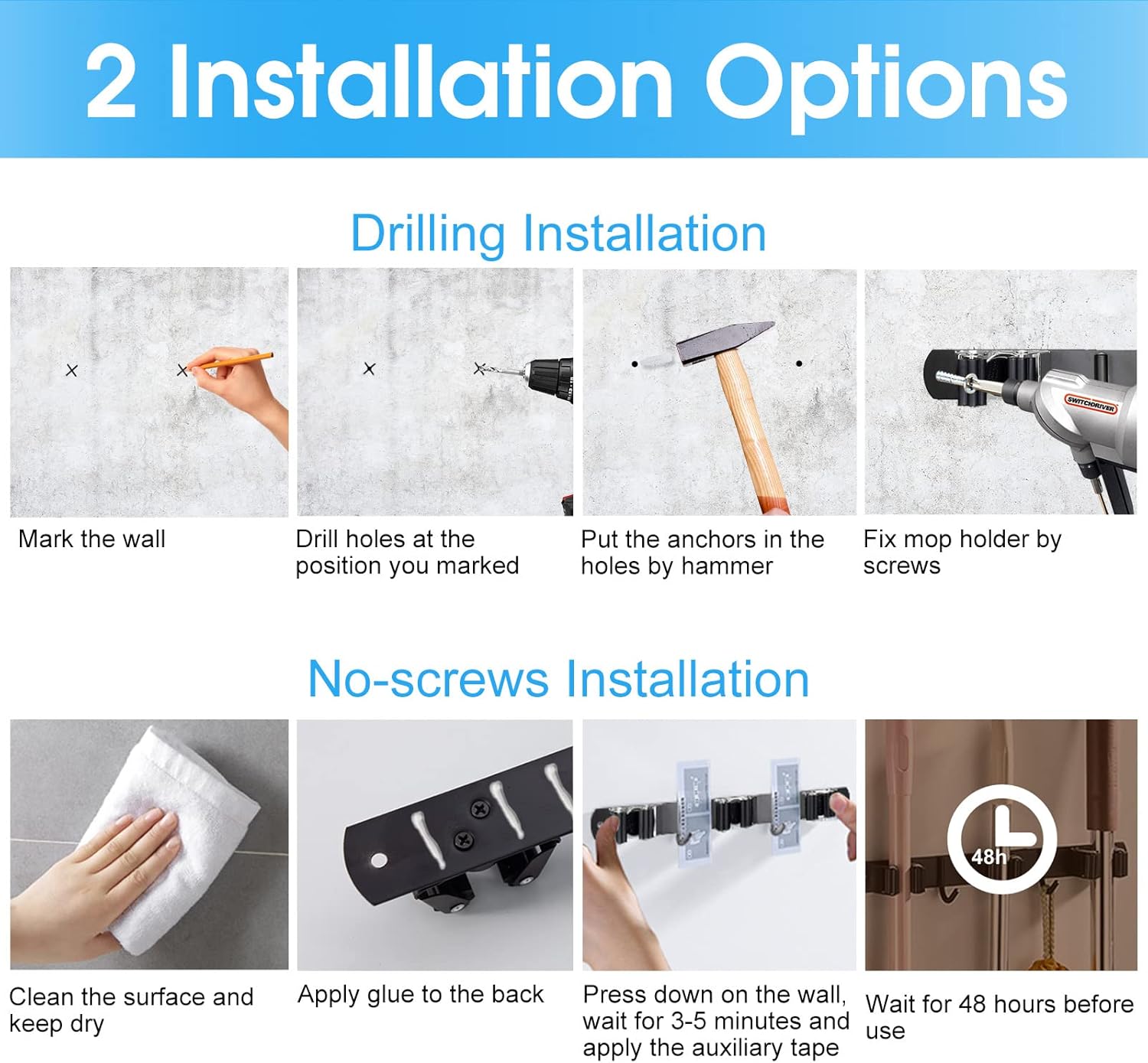 - Easy to install: The mop holder wall mounted comes with simple and clear instructions, making it easy to install with just a few basic tools. Whether you choose to use screws or adhesive, broom and mop holder the installation process is straightforward and can be completed in just a few minutes.