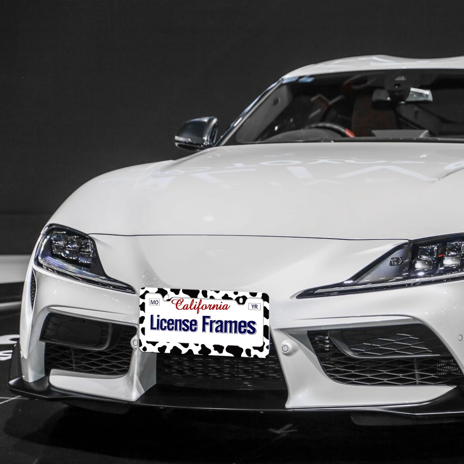 - Standard Size:This 2-hole black and white cow license plate frame measures 12.3"X 6.3"to fit all standard size U.S.license plates and protects the front and rear panels of the vehicle.The narrow border of the license plate frame does not obscure the status label or cover the state name of the license plate.