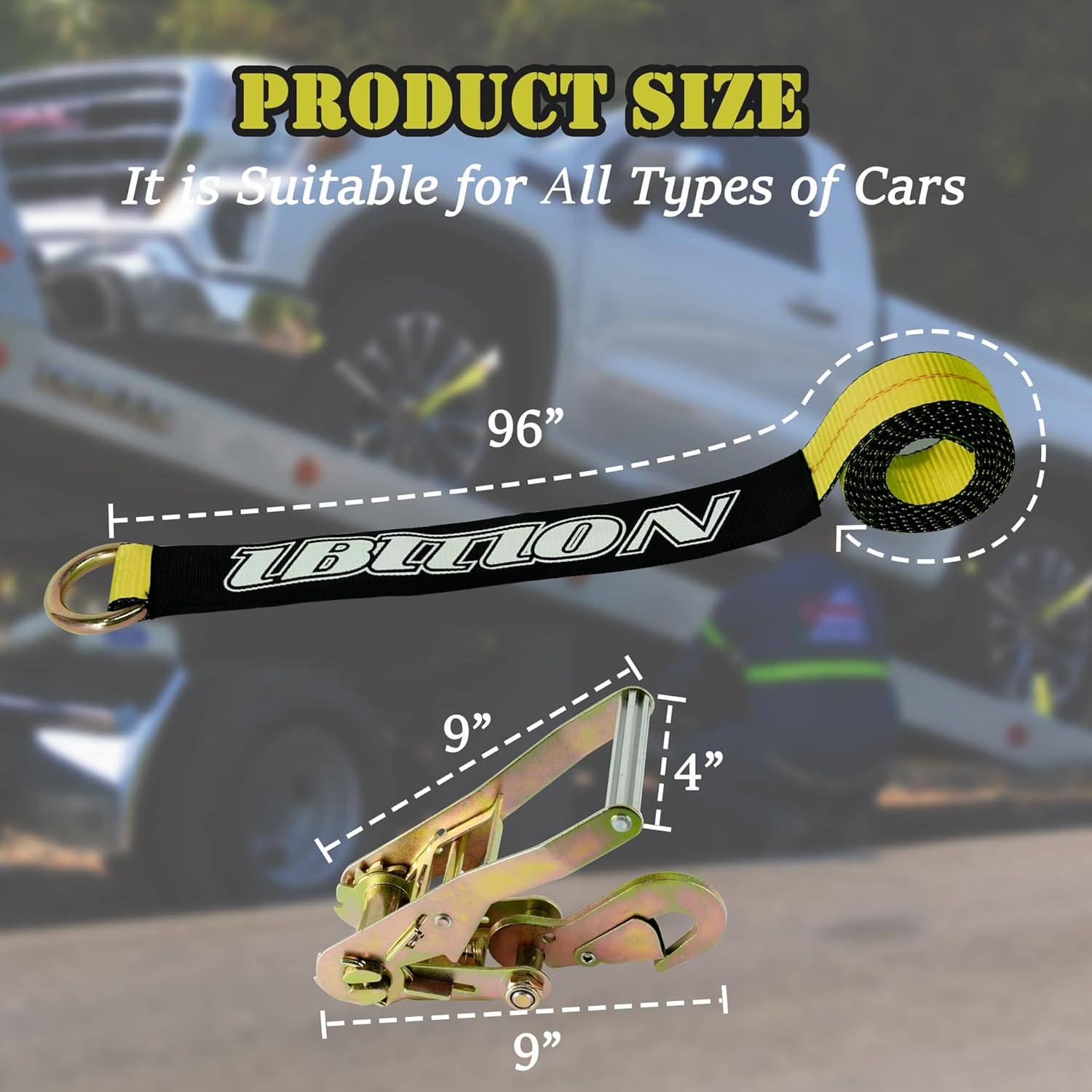 - 【Heavy-Duty Construction】Heavy duty tie down straps are crafted from premium quality materials, including durable polyester webbing and robust snap hooks. This construction guarantees strength and longevity, making them ideal for both light and heavy vehicles. (4) 2 Inch x 96 Inch Lasso Straps, (4) Ratchet with Snap Hooks ,(4) 2 Inch x 16 Inch Wear pad