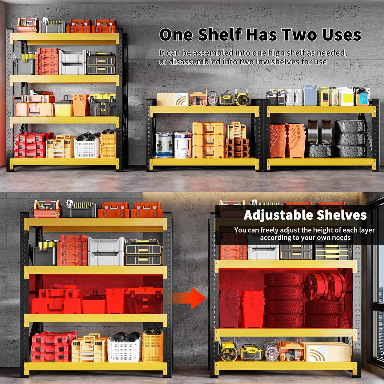 - 5000 LBS Heavy Duty Garage Shelving: Our Garage Storage Shelves are made of all-metal and feature a triangular mechanical design at both ends to enhance stability. The garage shelves are connected by screws and lock pins. There are multiple reinforcing ribs on the back of the metal shelving, which greatly enhance the load-bearing capacity. The total load capacity of the garage shelf unit is 5,000 pounds. It is very suitable for storing heavy objects such as tires, generators, and oil tanks.
