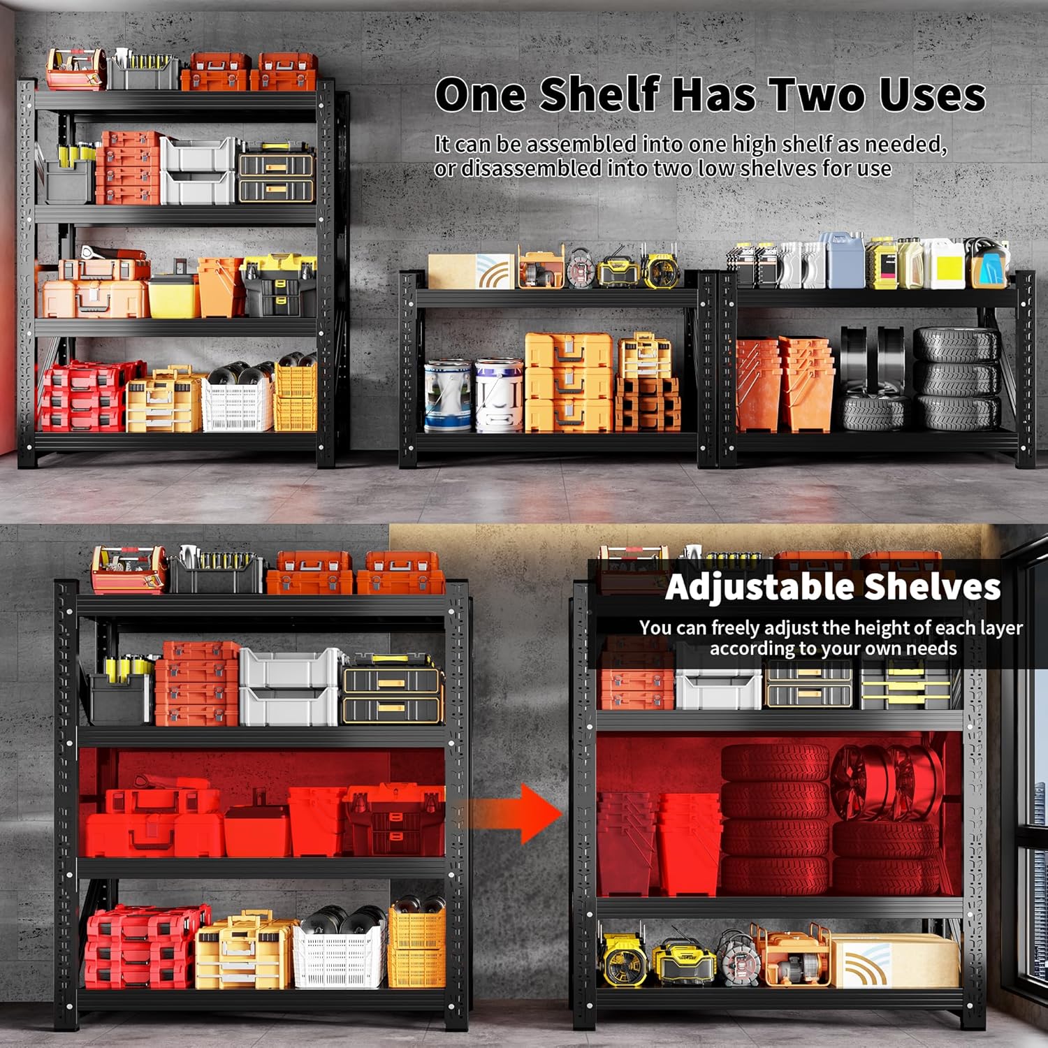 - 4000 LBS Heavy Duty Garage Shelving: Our heavy metal rack are made of all-metal and feature a triangular mechanical design at both ends to enhance stability. The garage shelves are connected by screws and lock pins. There are multiple reinforcing ribs on the back of the metal shelving, which greatly enhance the load-bearing capacity. The total load capacity of the garage shelf unit is 4,000 pounds. It is very suitable for storing heavy objects such as tires, generators, and oil tanks.