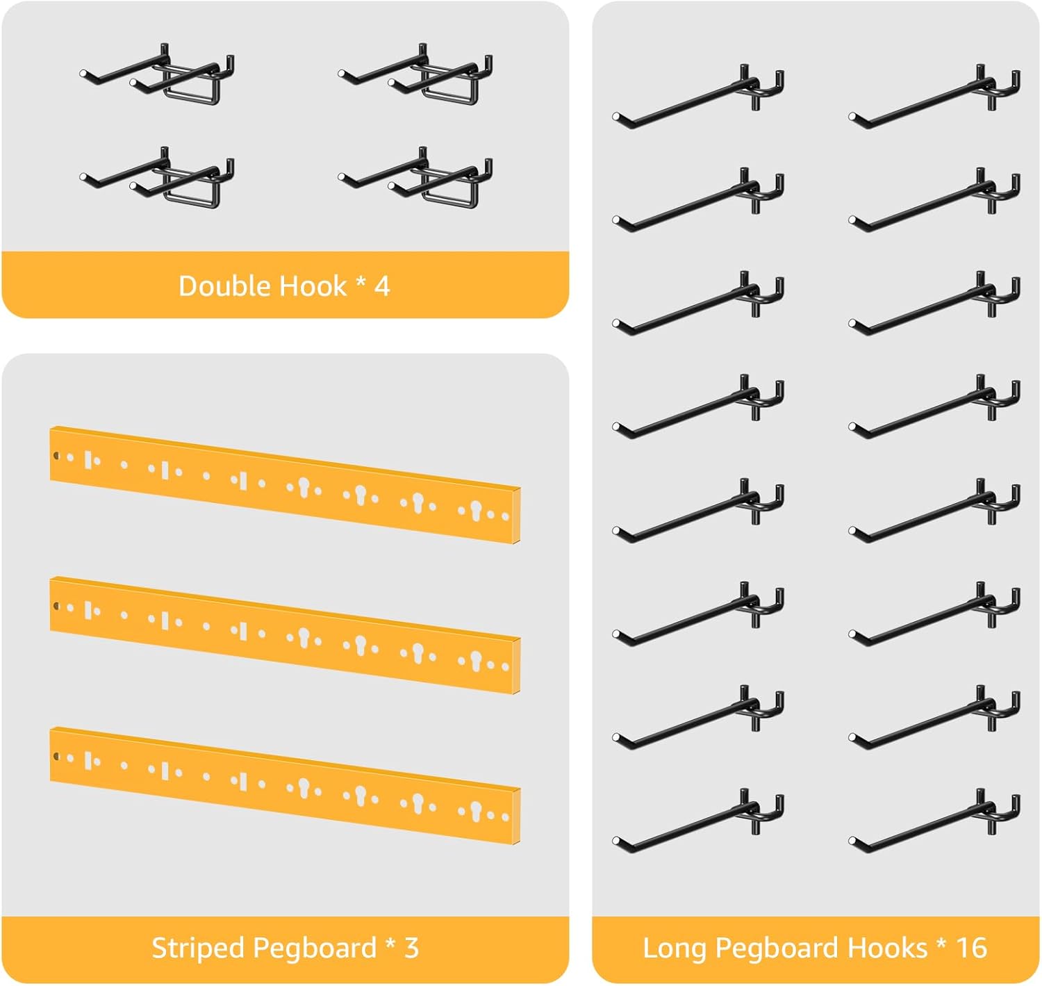 - Yellow modular wall mount pegboard strip, 3 strips with 16 pegboard hooks and 4 pegboard double hooks. Can help store a lot of tools to keep things tidy. Great for building a pegboard wall in your shop, garage, laundry or tool storage area.
