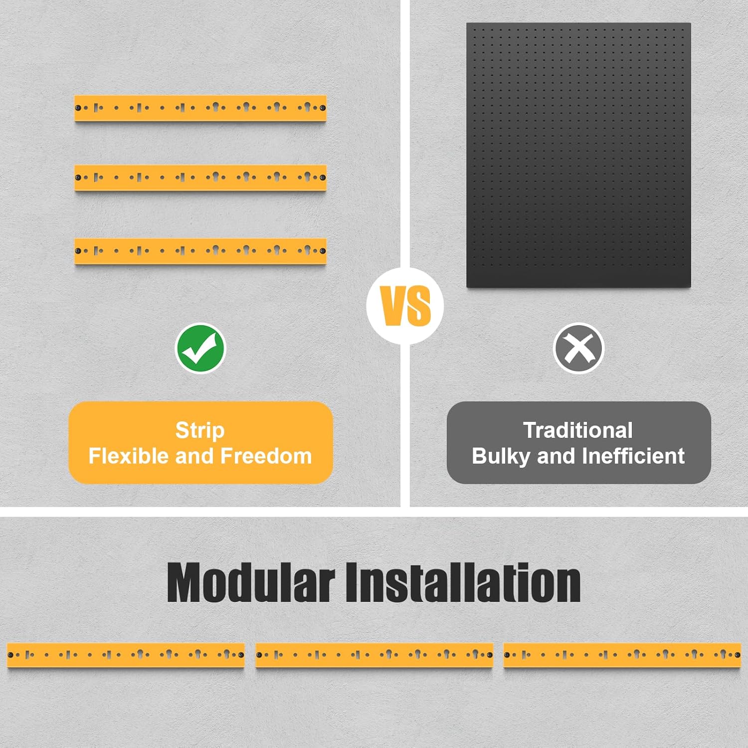 - Innovative transformation of large pegboards into pegboard strips, Avoid the embarrassment of not having enough wall space to install a large pegboard. pegboard strips are more flexible and don't take up much space. The pegboard holes will not be obscured by the tool.