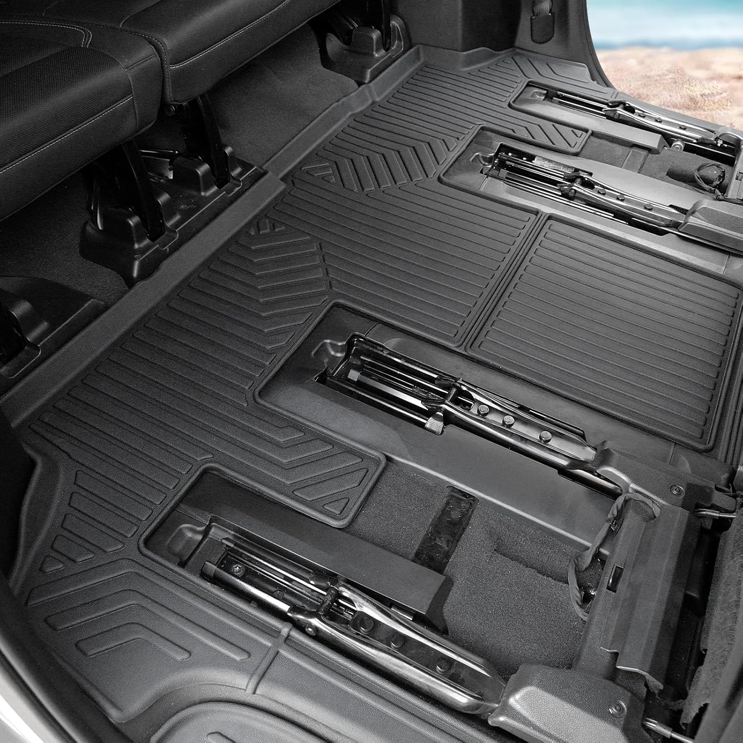 - Custom Fitment: Precisely engineered with 3D laser scanning for 2021 2022 2023 2024 2025 Chevy Suburban / GMC Yukon XL with 7-passenger seating (2nd-row Captain's Chairs). Includes floor mats, cargo liner, 3rd row seat back protectors, 4PCS door sill guards – 30% more components than standard sets