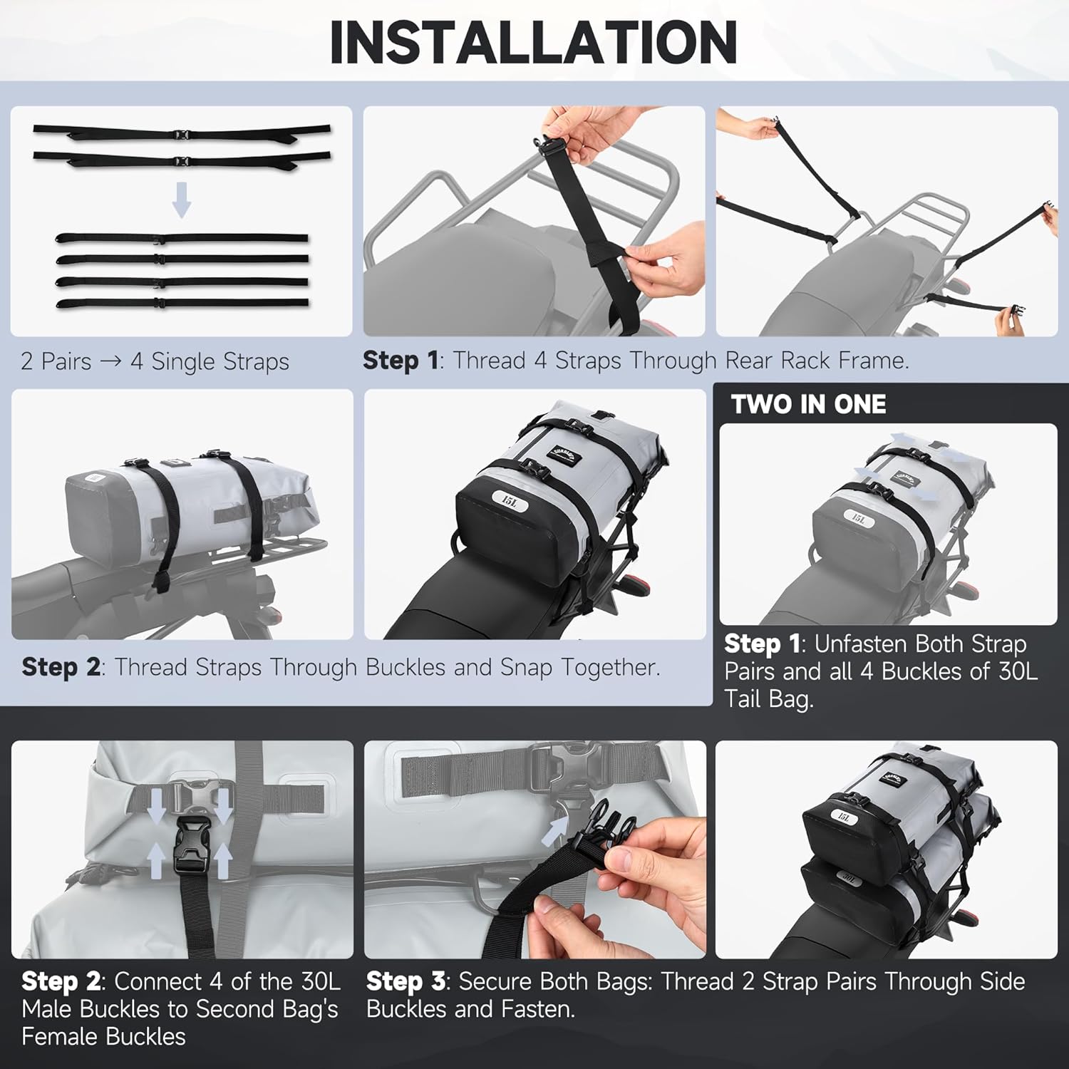 - Rider-Optimized Functional Design. The Gurblofy motorcycle tail bag is engineered with the rider in mind: Its heavy-duty PVC construction withstands all weather conditions, while storm-proof zippers ensure secure closure. The pack features quick-adjust buckles for instant sizing, and our patented textured handle design delivers a firm grip even with gloves. Multi-position straps distribute weight evenly across your back for fatigue-free riding adventures.