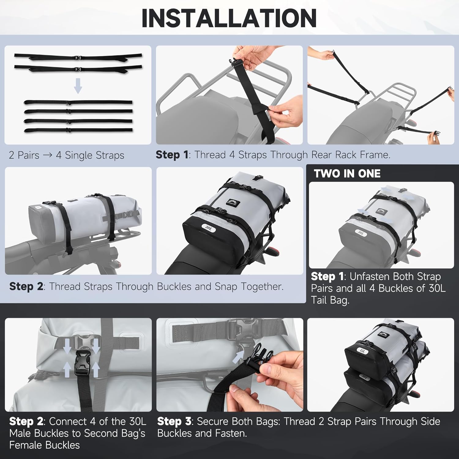 - Rider-Optimized Functional Design. The Gurblofy motorcycle tail bag is engineered with the rider in mind: Its heavy-duty PVC construction withstands all weather conditions, while storm-proof zippers ensure secure closure. The pack features quick-adjust buckles for instant sizing, and our patented textured handle design delivers a firm grip even with gloves. Multi-position straps distribute weight evenly across your back for fatigue-free riding adventures.