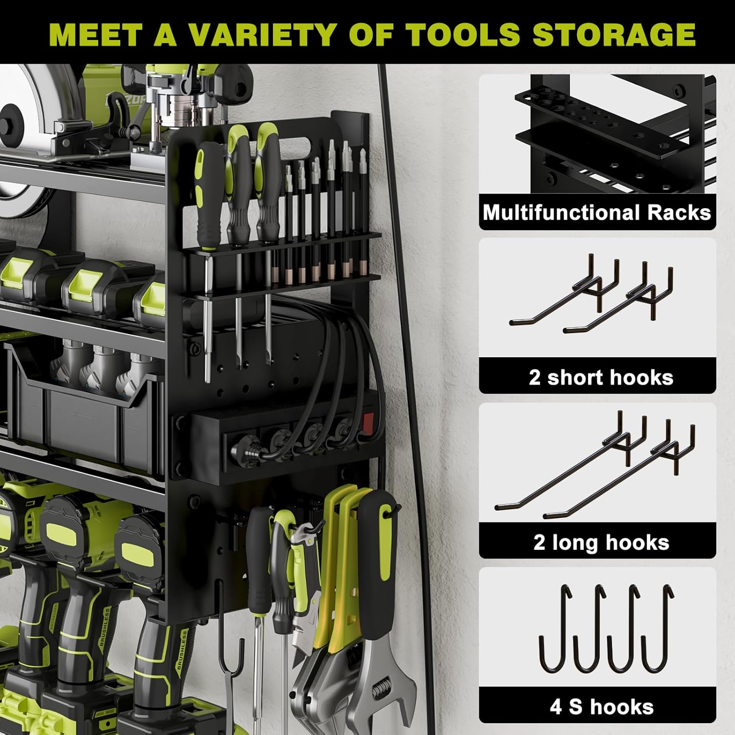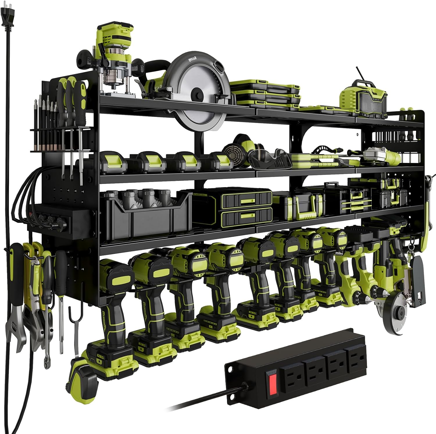 - Customizable Design: The 4-hole power strip can be mounted on either side for convenience, and the adjustable shelves give you full flexibility to organize your tools the way you want