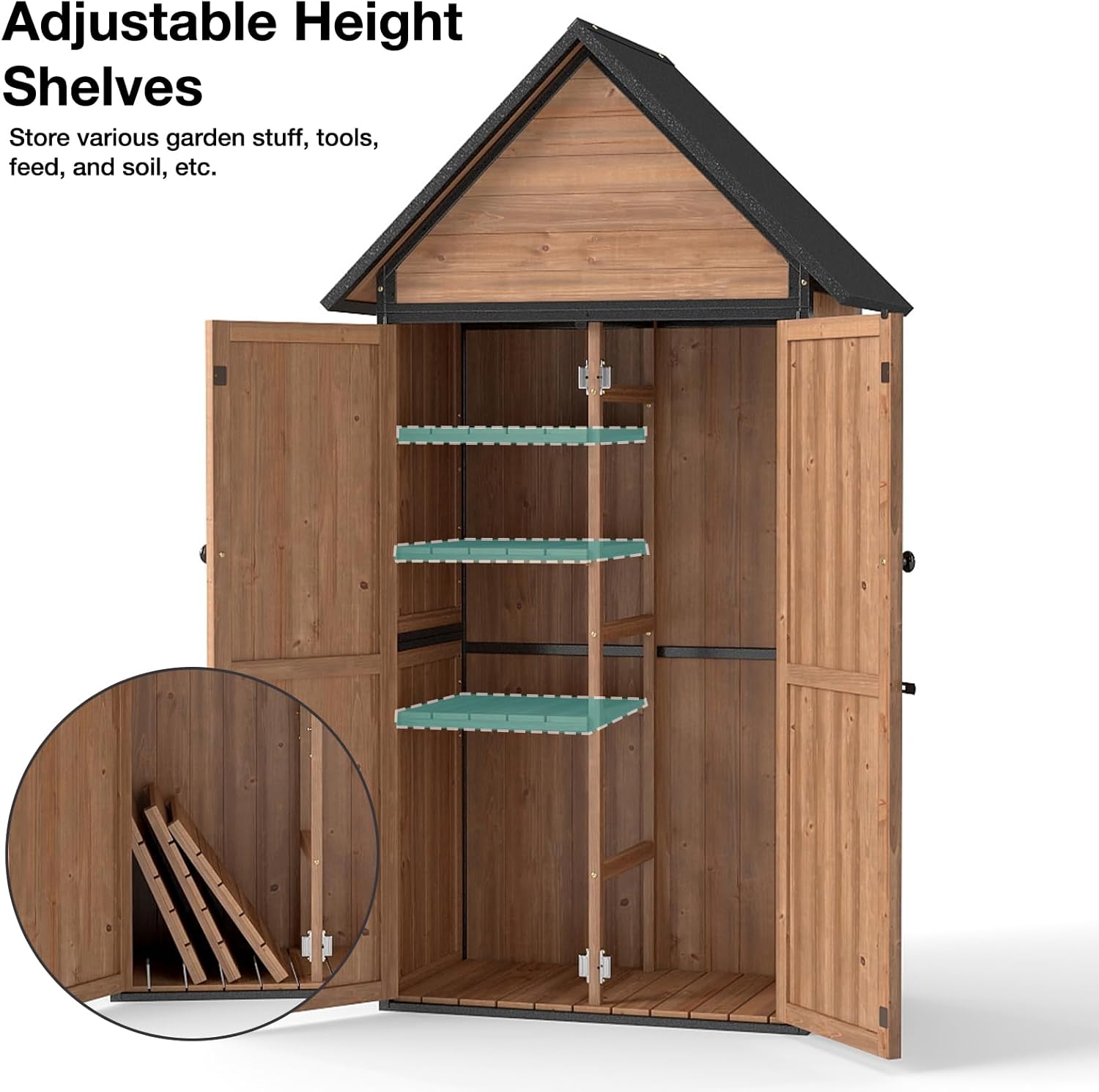 - Weatherproof & Elevated Design – The garden storage tool shed features a sloped roof to prevents rainwater pooling and raised fir floor blocks moisture, keeping tools dry in any season.