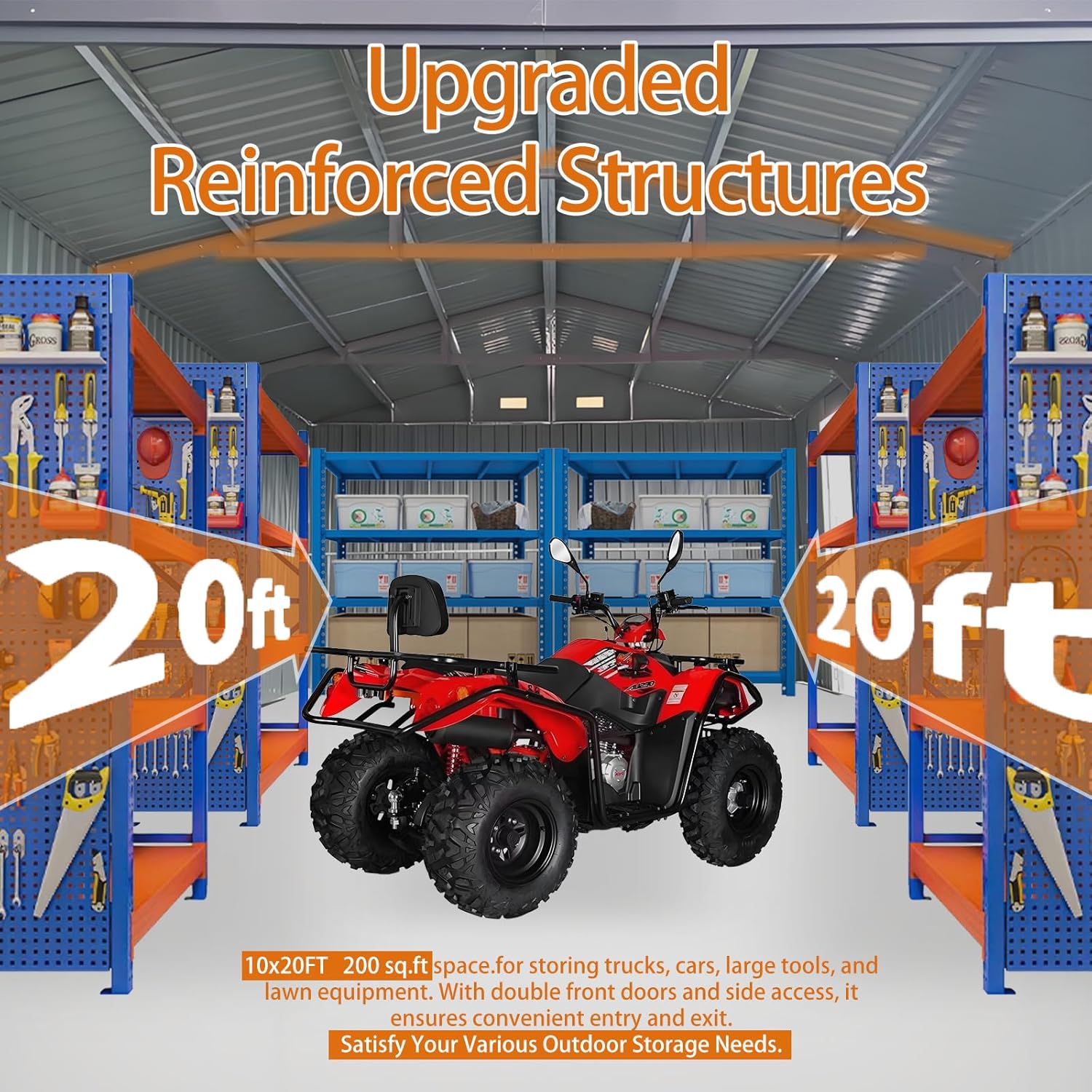 - Outdoor Storage Shed for Maximum Space Utilization: Our outdoor storage shed, featuring a generous 250 square feet of floor space, metal shed heavy duty reinforced metal frame with 20lbs/sqft Snow Load capacity and 50M/ph Wind Resistance, ideal for trucks, cars, large tools, and lawn equipment, it ensures you never run out of storage again.