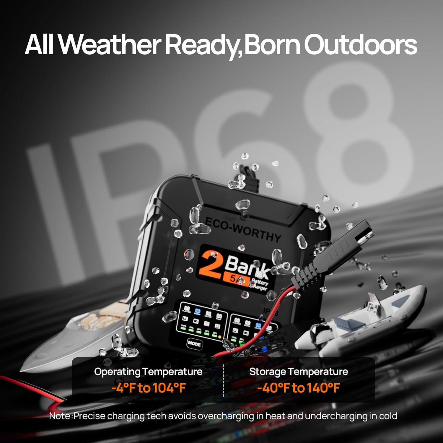 ECO-Worthy 2-Bank Marine Battery Charger 10A (5A/Bank), IP68 Waterproof 12V Charger & Maintainer for Boat RV Car, Lead-Acid LiFePO4 & Calcium Battery Desulfator