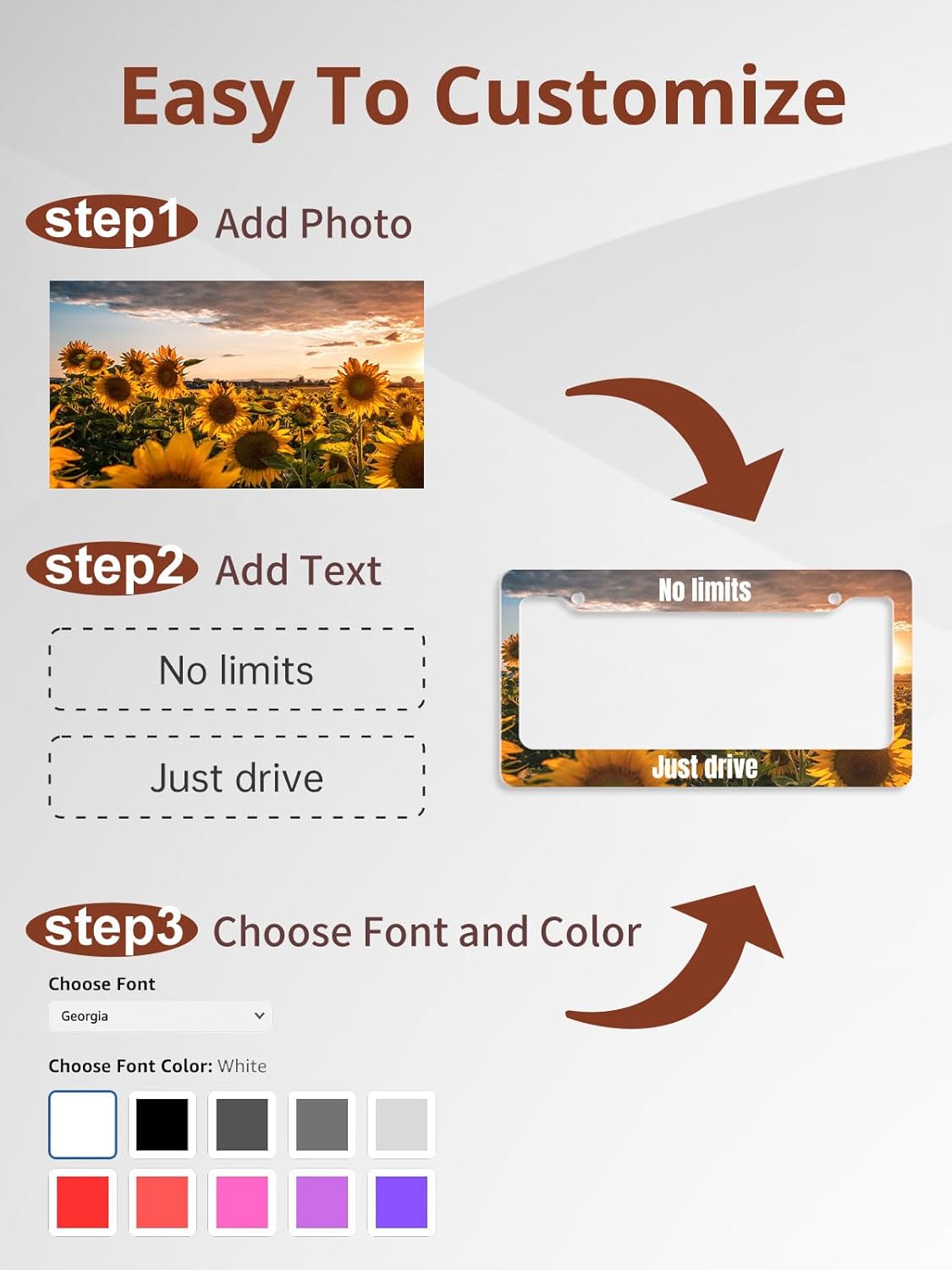 - 【Guide To Customizing license plate frame】: Click “Customize Now” to choose a background color or upload a special photo, add your text, and make it yours. Pick a font and color you love—your unique custom license plate frame is just a few clicks away. We’ll craft your personalized license plate frame with care, just for you.