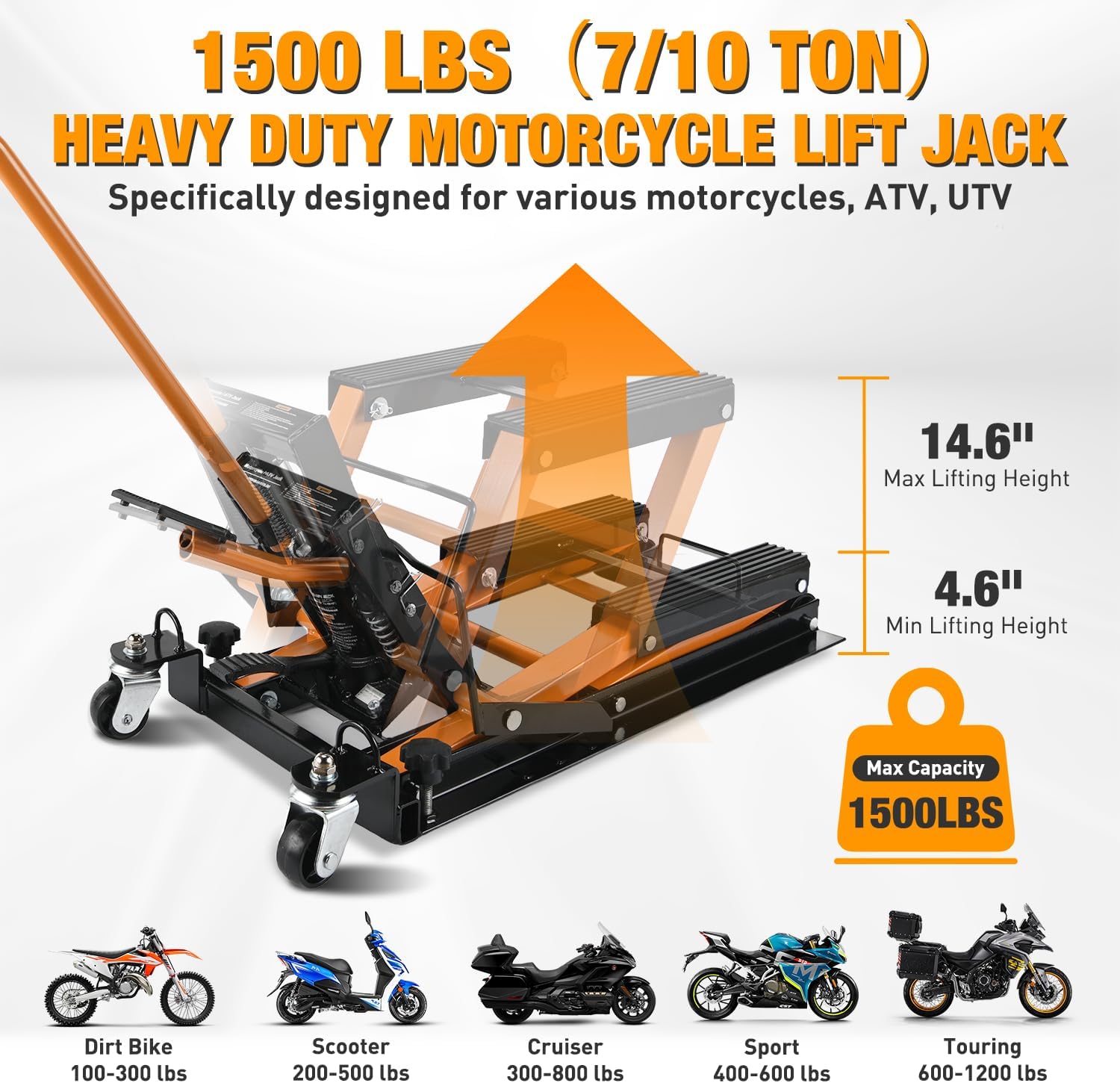- POWERFUL MOTORCYCLE LIFT: Nilight hydraulic foot-operated motorcycle scissor lift jacks can safely handle up to 1500 lbs / 0.7 tons. The hydraulic scissor motorcycle floor jack helps you lift motorcycles like Harley Davidson quickly and easily with minimal resistance, fit for almost any standard motorcycle, touring bike, cruiser, ATV, motocross bikes. Great for use in the garage, shop or track for your repair or cleaning