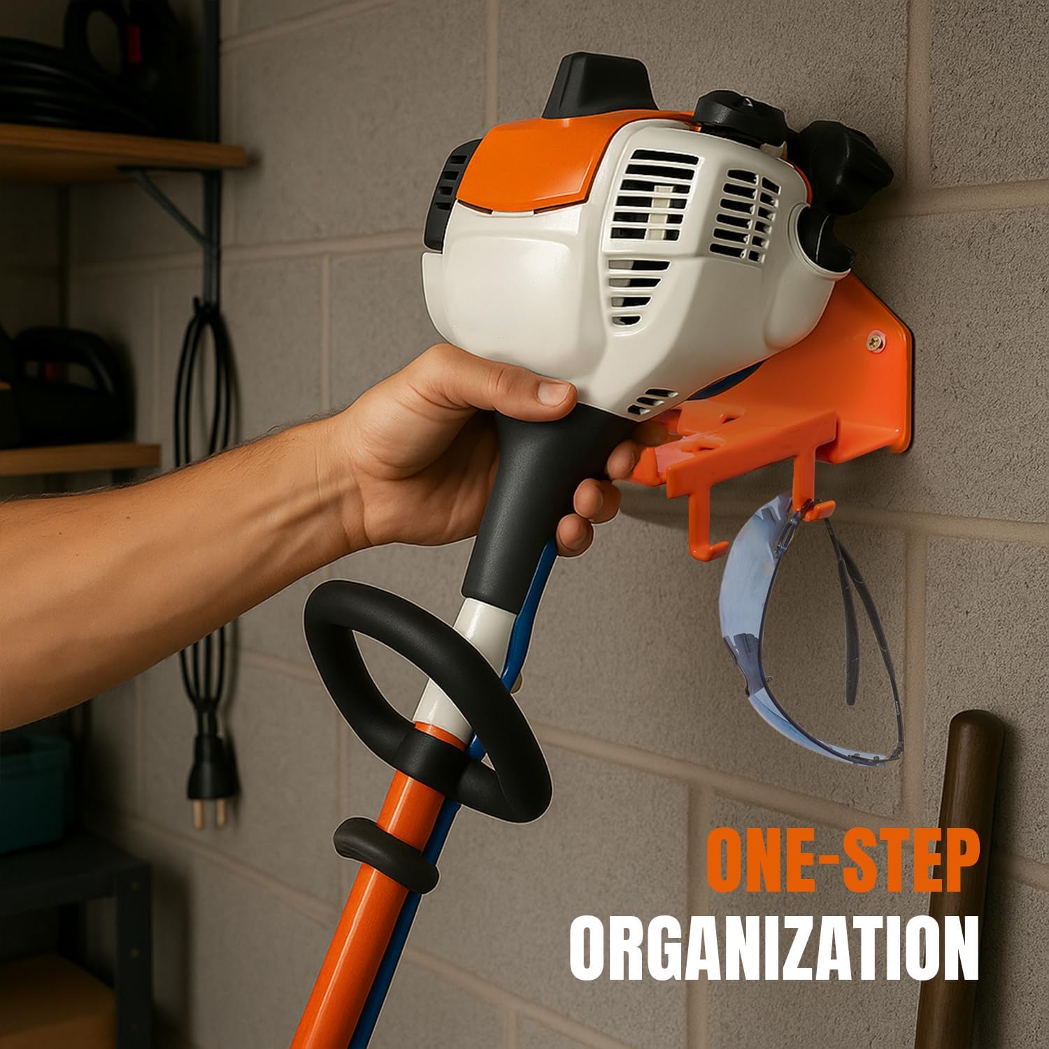 - [ SPACE SAVING & EFFICIENT ] : Keep tools off the ground with this smart weed eater mount and shed storage system. Frees up floor space in your garage, shed, or patio while keeping weed wacker holder for garage tools accessible. Ideal for garage organization and mens garage must haves, this rack doubles as durable utility hooks for maximum flexibility.
