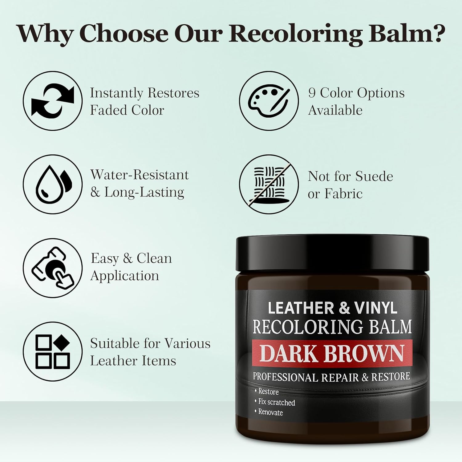 - Restore Leather Couches & Furniture:Designed specifically as a leather restorer for couches and leather couch color restorer, this balm removes stains and scratches while delivering even color coverage. It's also ideal as leather paint for furniture to rejuvenate tired-looking pieces.