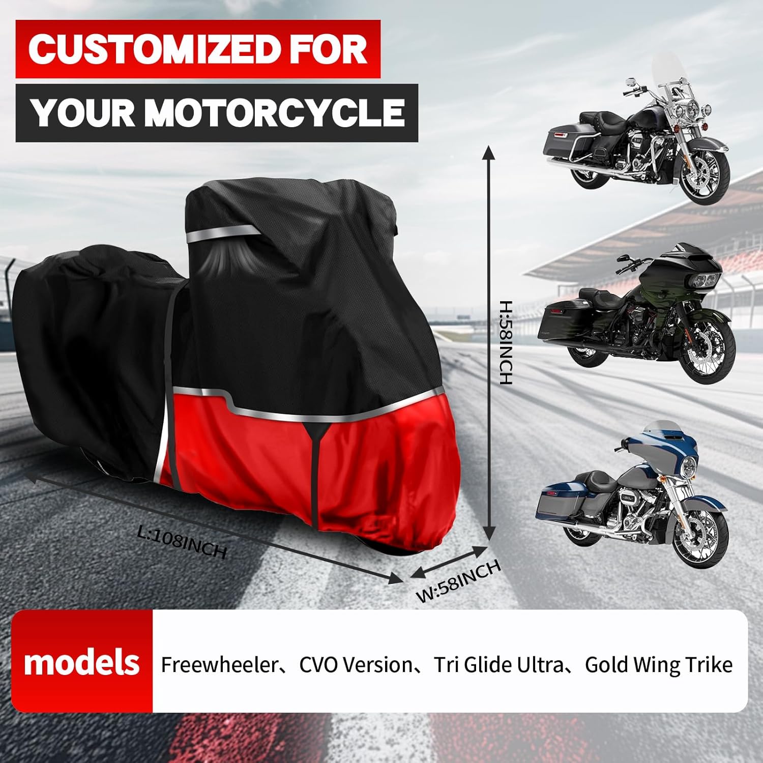 - Universal Fit: Compatible with most touring motorcycles. This motorcycle cover, without a trunk, accommodates side cases and is suitable for the Electra Glide Standard、 Road King、Road Glide、 Street Glide、 Road King Special.Road Glide Special、Street Glide Special、Road Glide sT、Street Glide ST、CVO Street Glide、 CVO Road Glide. Please measure your motorcycle and ensure the cover is at least 4 inches long for optimal coverage