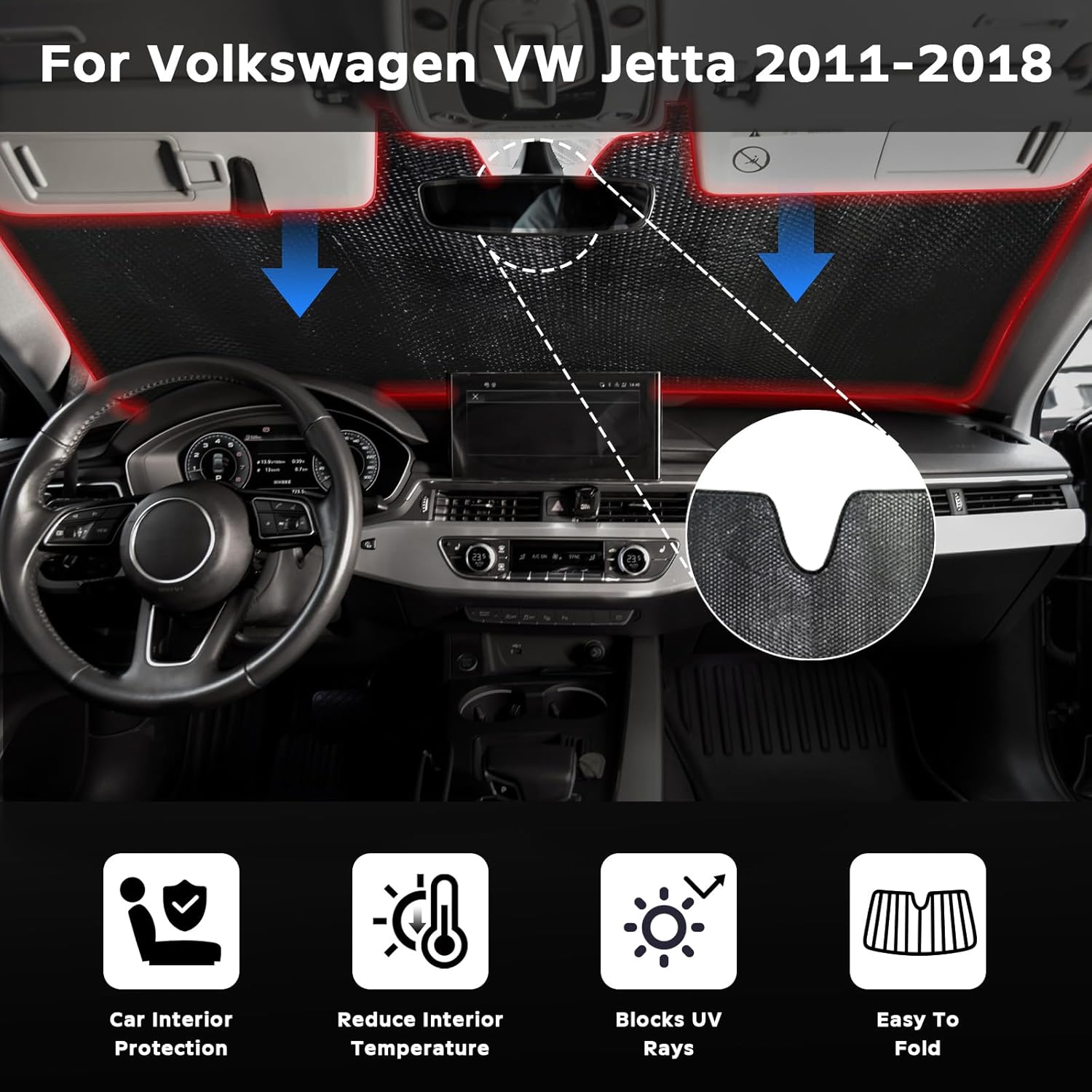 - Precise Fit: This sunshade designed specifically for the VW Jetta 2011-2018 front windshield. Blocks 99% of infrared radiation; reduces interior temperature. Protects dashboard/leather from radiation and high temperatures, preventing cracking