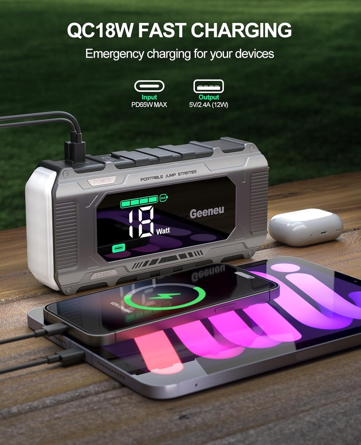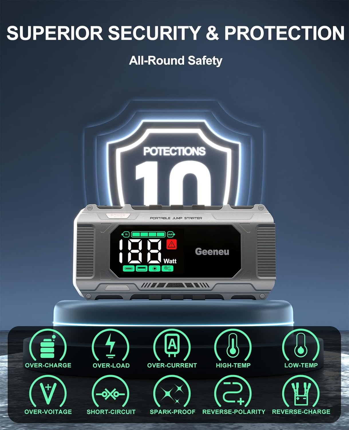 - HD LARGE LCD DISPLAY: Unlike traditional jump starters, this unit features a high-definition display that clearly shows all status indicators. You can easily keep track of battery level, charging wattage, and operational status – ensuring trouble-free use