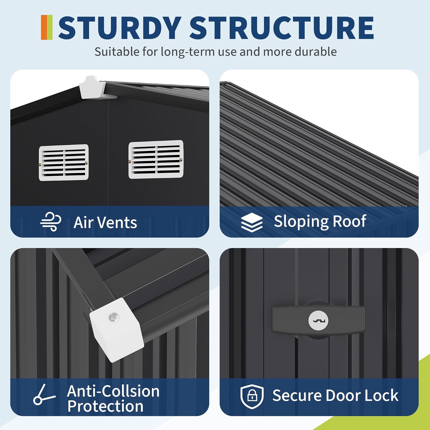- SLOPED ROOF & LOCKABLE DOOR & AIR VENTS - The sloped roof is designed to let rainwater flow out quickly. The lockable doors can enhance security and prevent strangers or small animals from entering accidentally. The design of air vents can effectively improve air circulation and prevent your items from getting moldy and damaged in humid and hot summers. Plastic protective caps are provided for the sharp corners of the ceiling and each screw to prevent injuries during construction or use