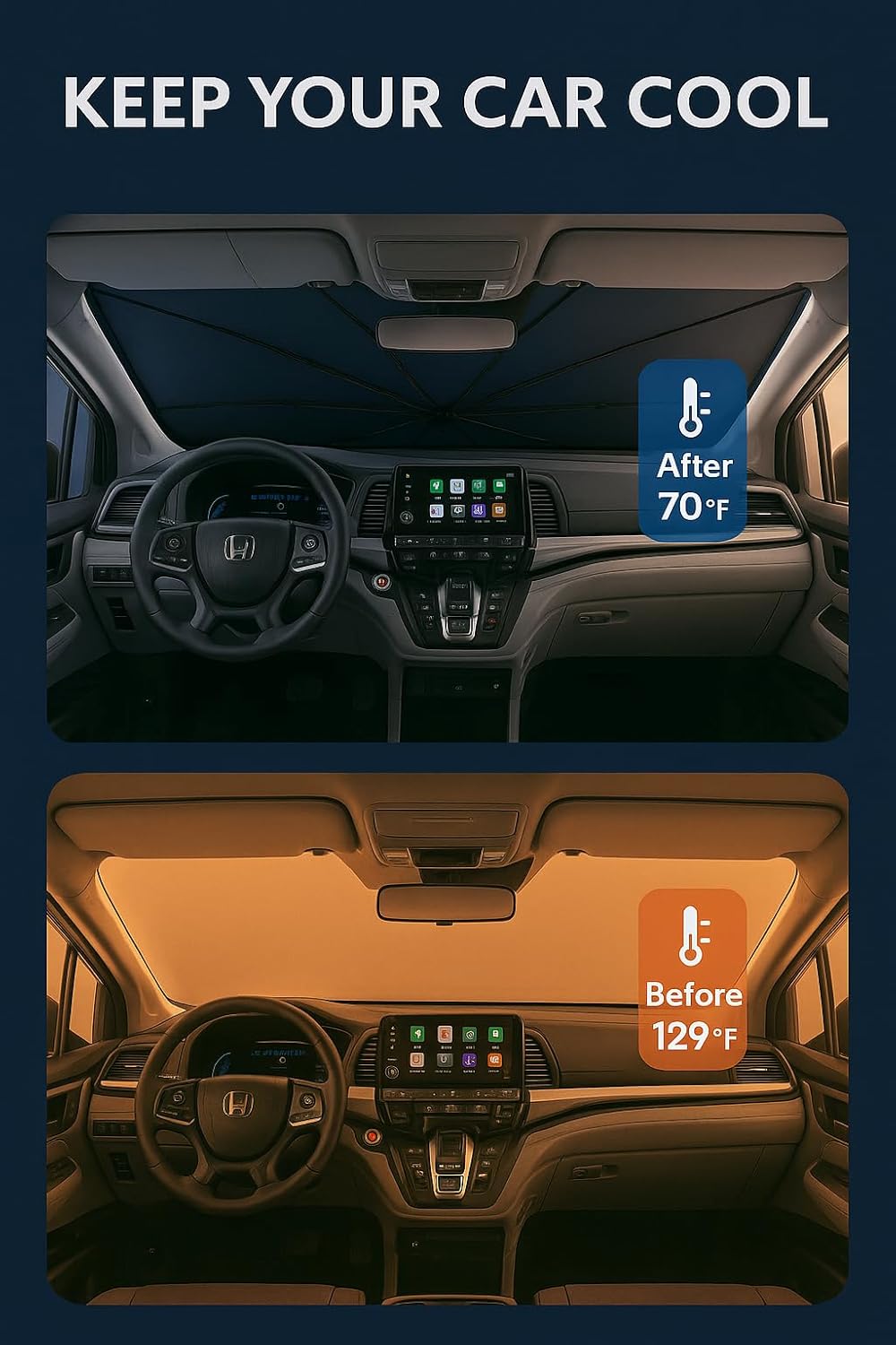 - Certified Sustainable. Customized Windshield Sunshade: Specially designed for the 2018-2025 Honda Odyssey with precise mirror cutouts, providing 100% shading, carbon fiber handle, ensuring lightweight and durability while also having a fashionable feel. Our Odyssey windshield sunshade can protect the interior of your car from various light damage and prevent dashboard and seat degradation.